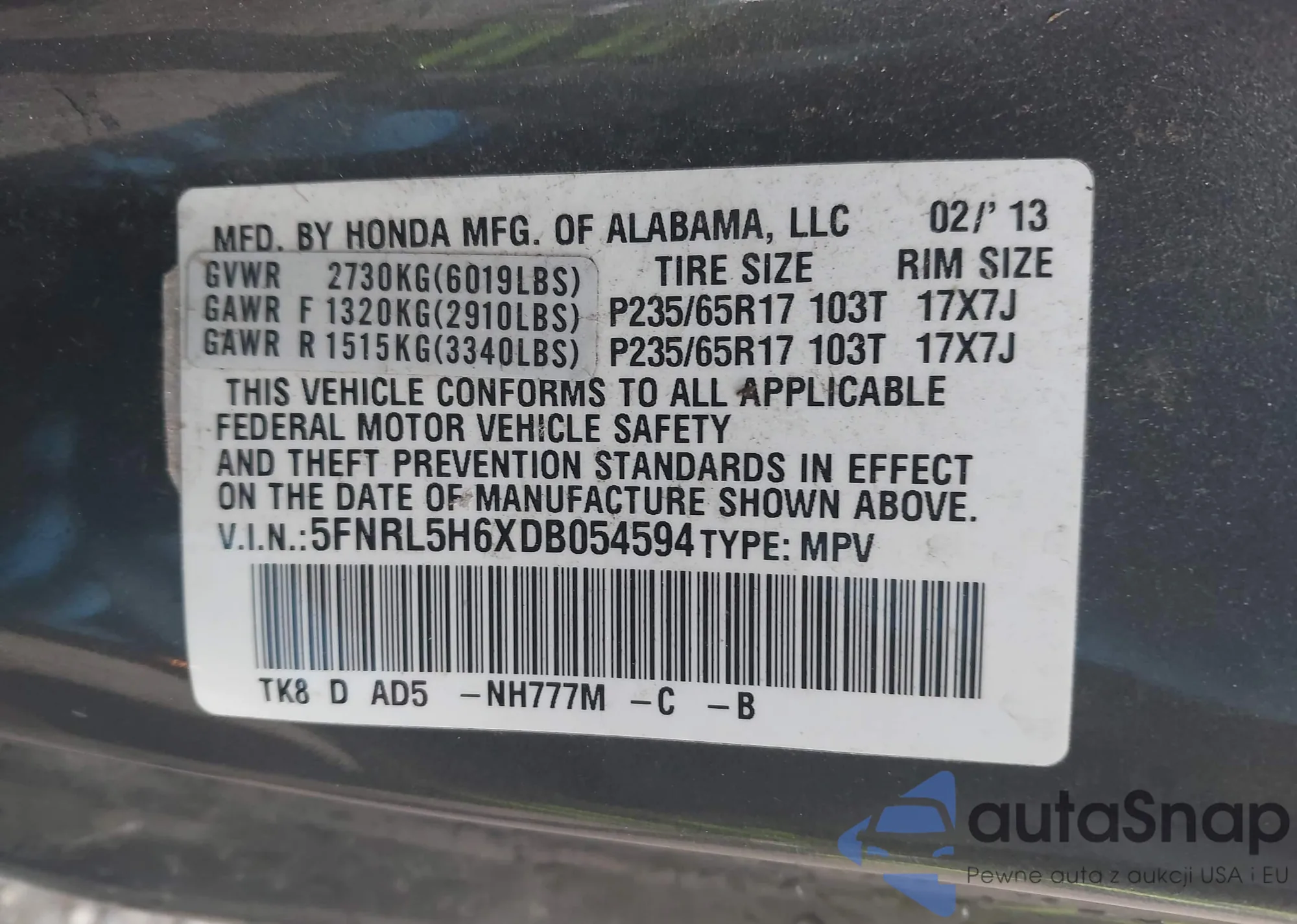 • VIN 5FNRL5H6XDB054594