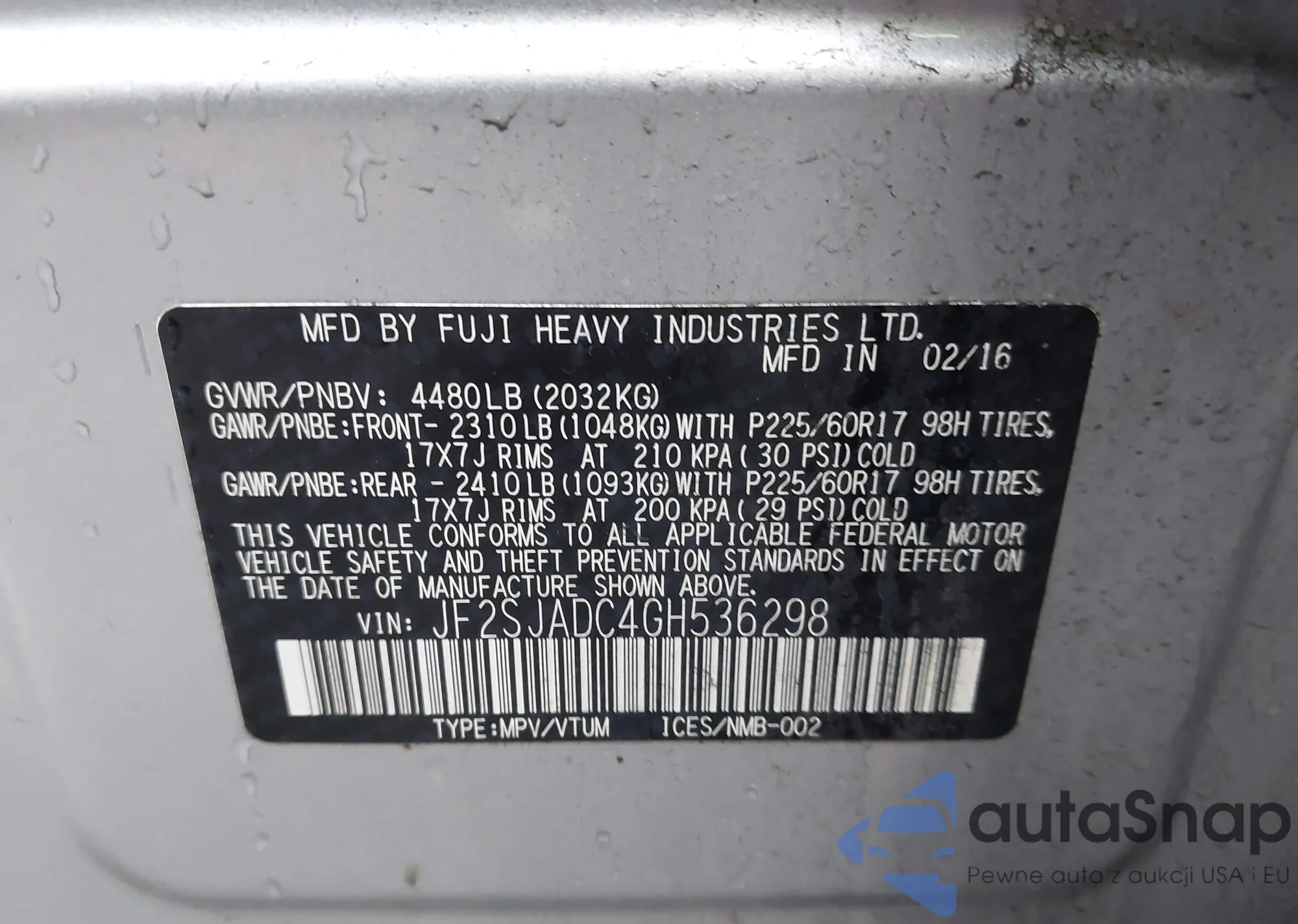 LOT: 43987316 VIN: JF2SJADC4GH536298