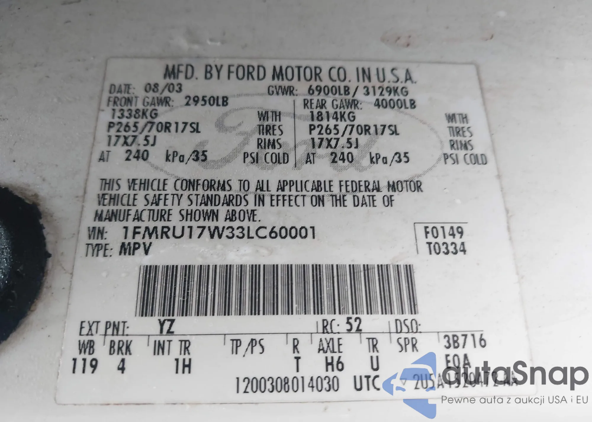 LOT: 44008329 VIN: 1FMRU17W33LC60001
