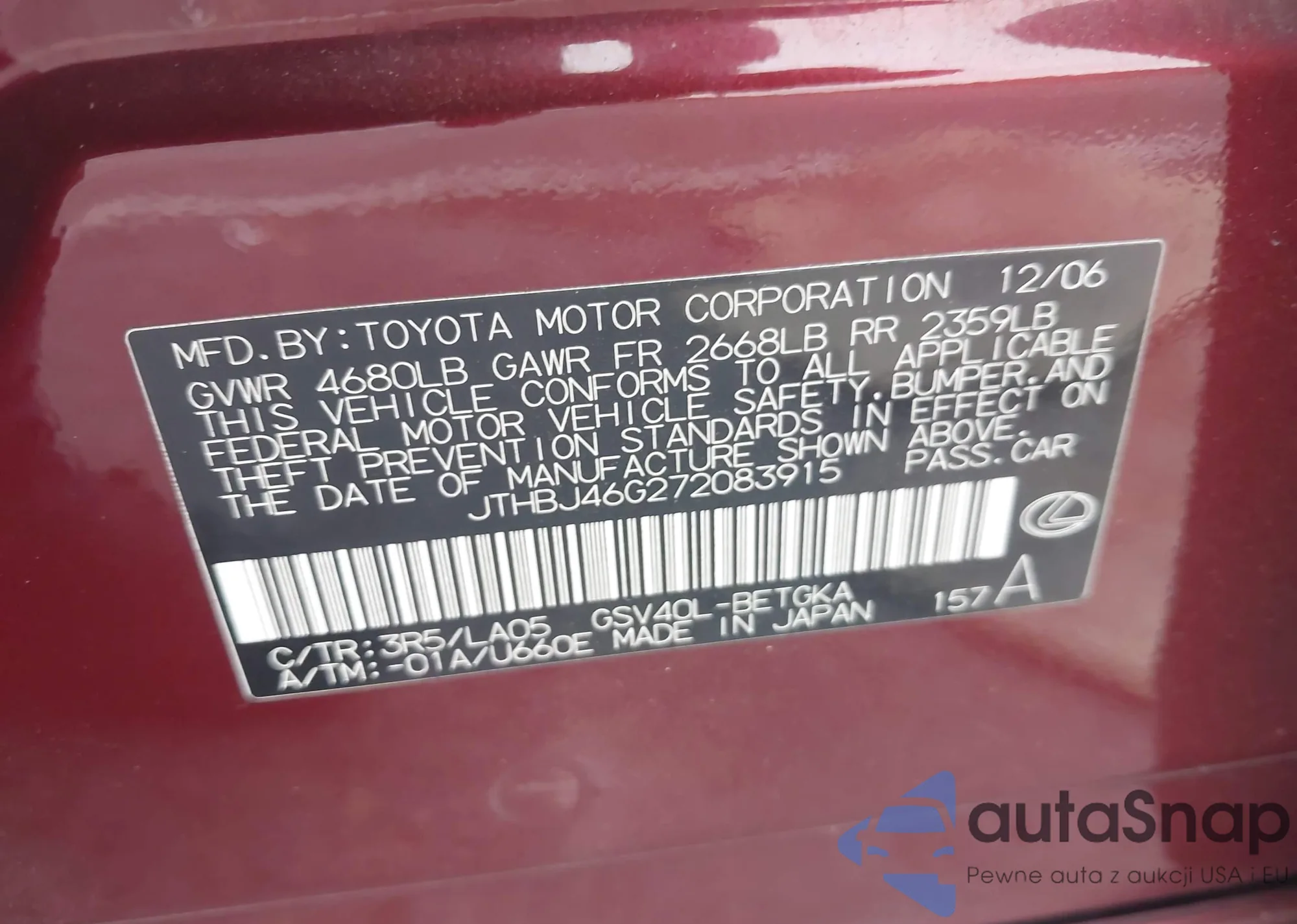 LOT: 44002849 VIN: JTHBJ46G272083915