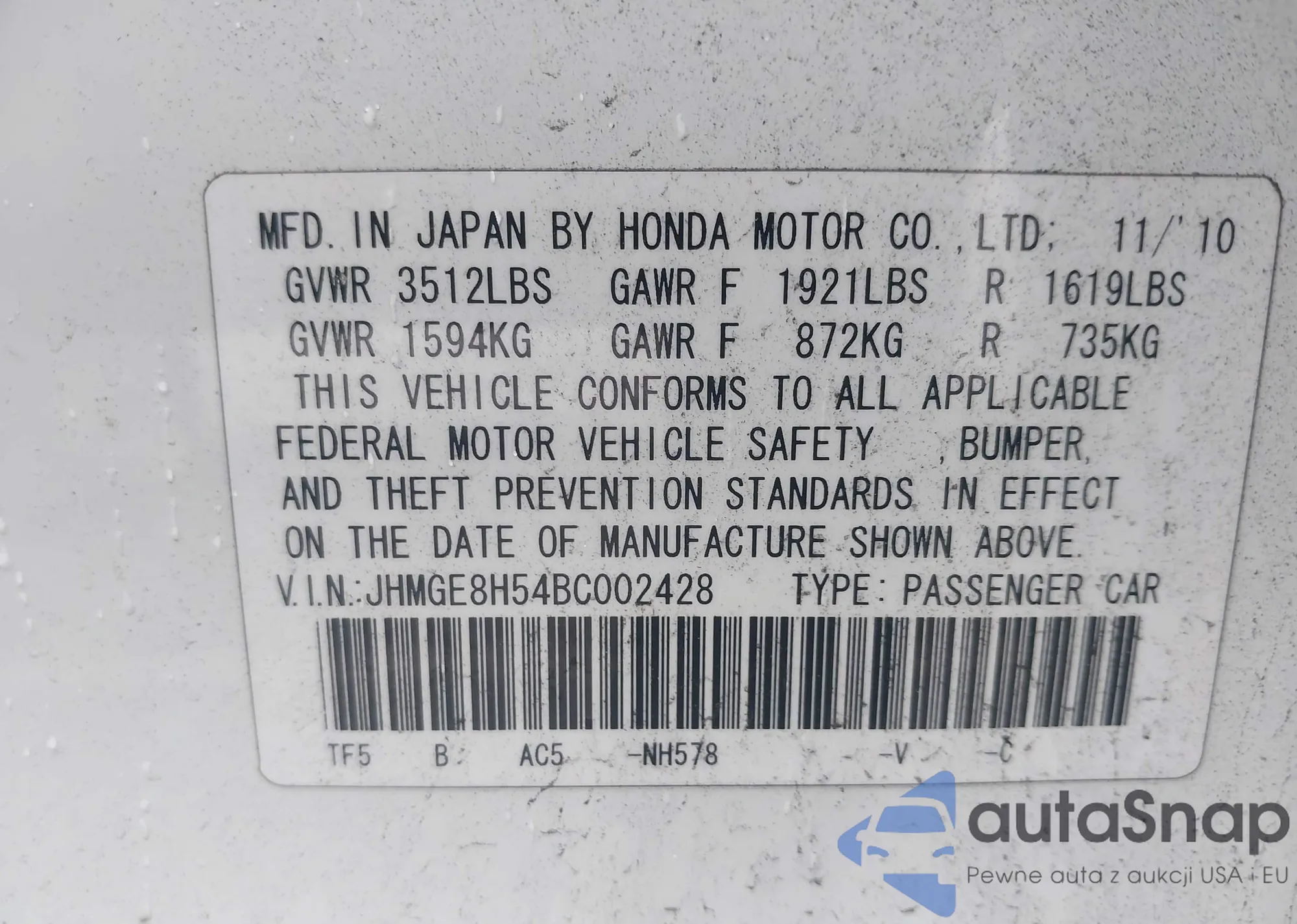 • VIN JHMGE8H54BC002428