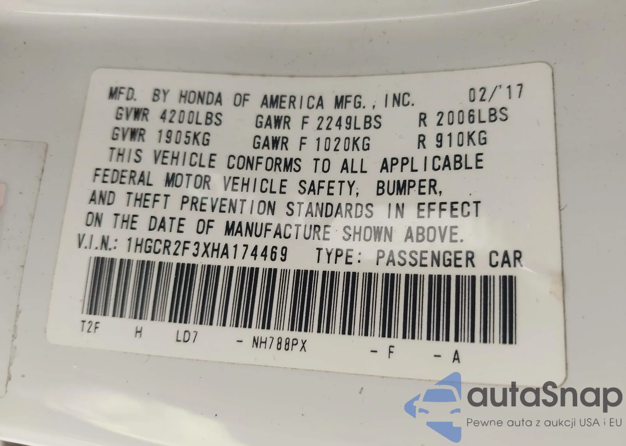 • VIN 1HGCR2F3XHA174469