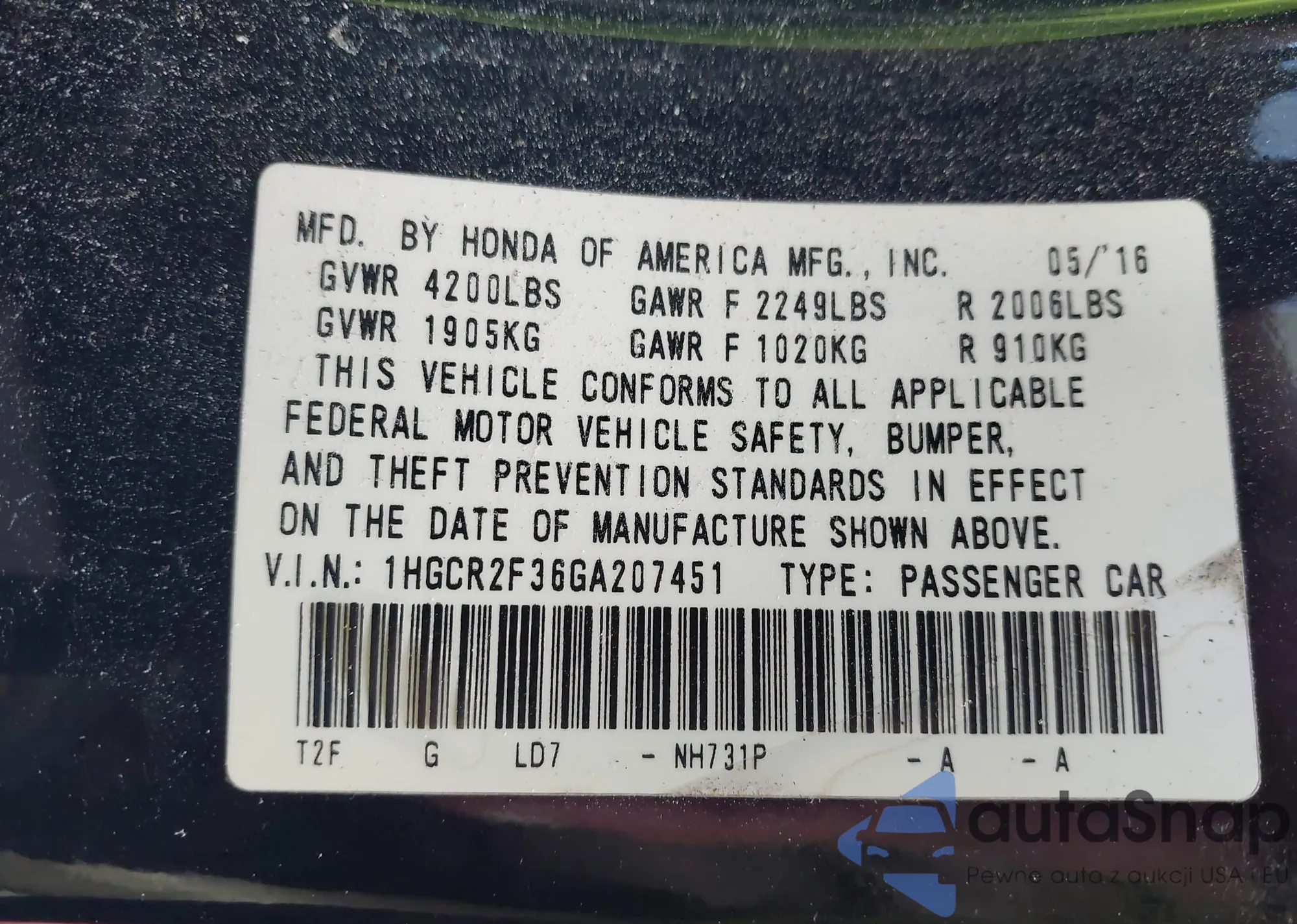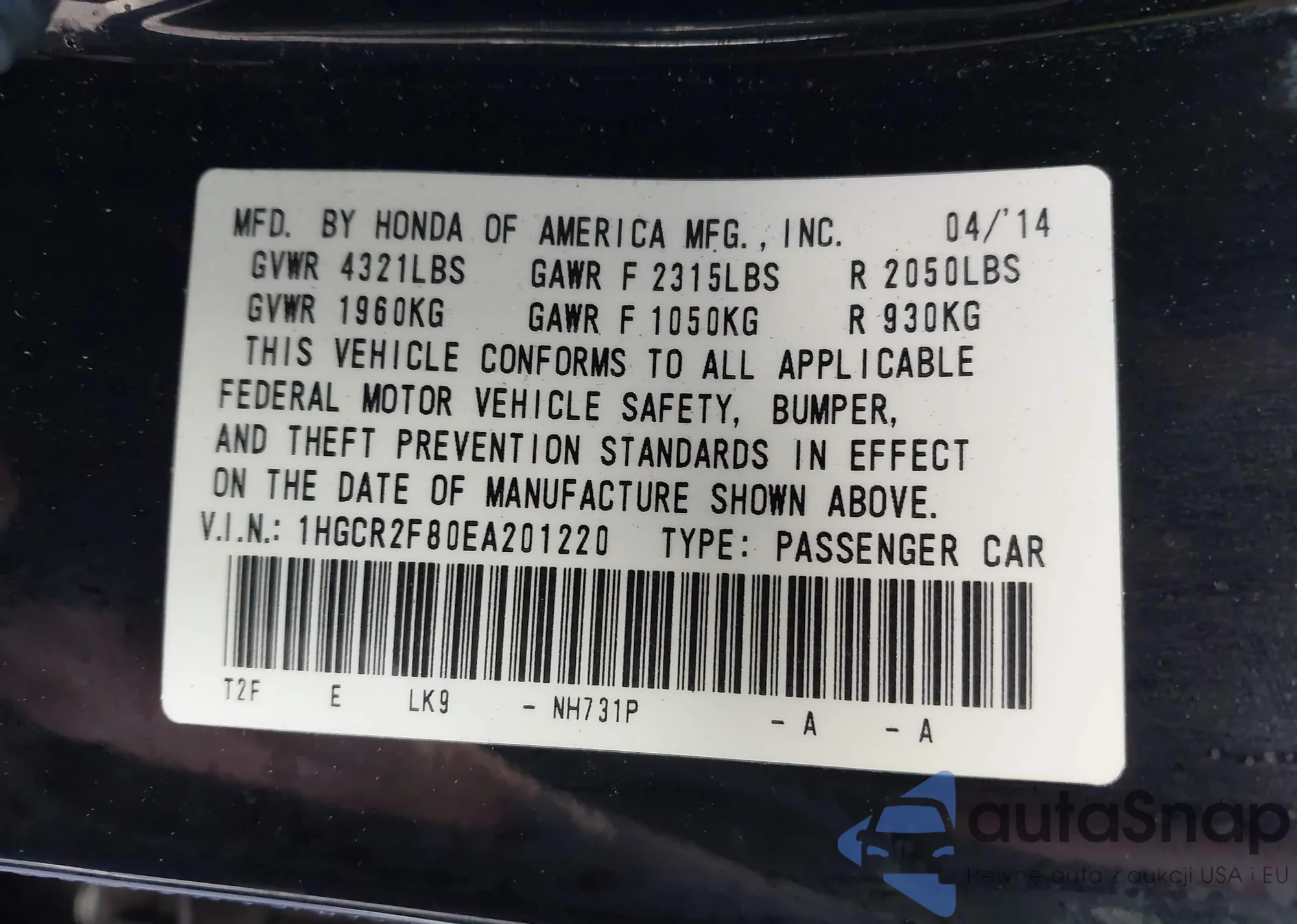• VIN 1HGCR2F80EA201220