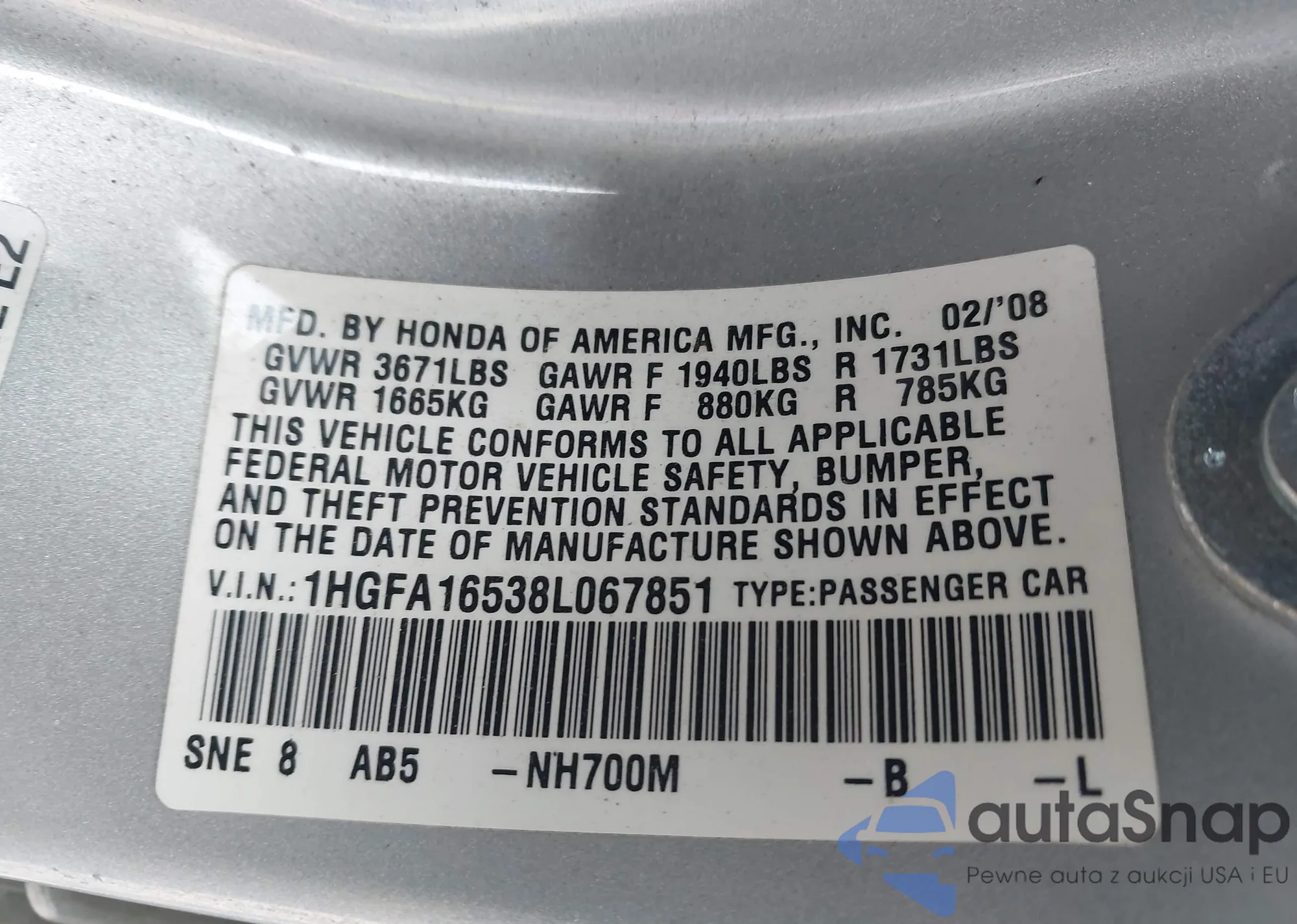 LOT: 43920506 VIN: 1HGFA16538L067851
