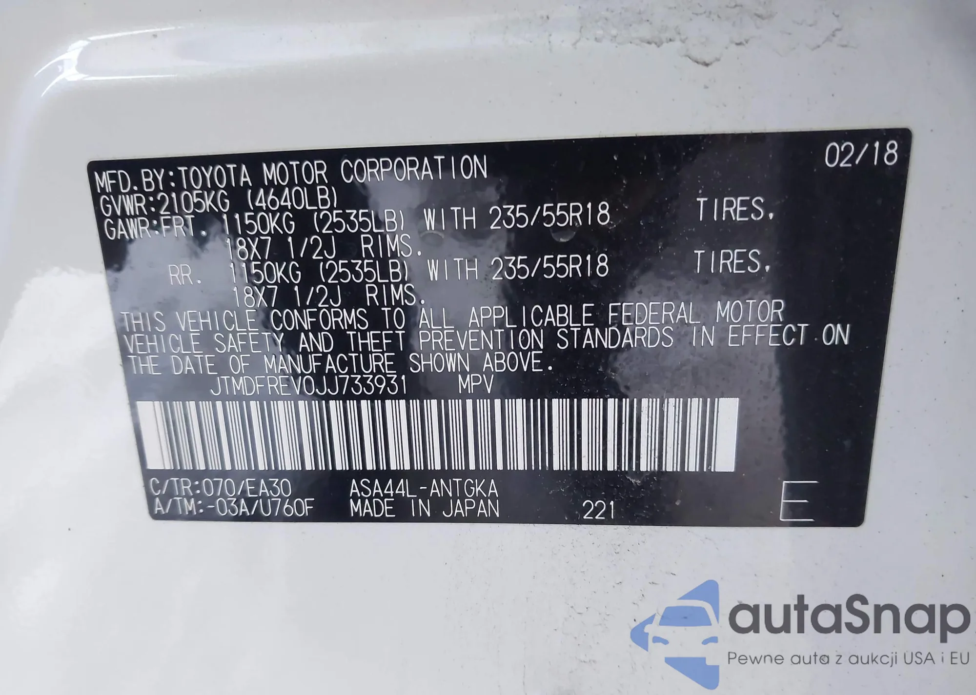 LOT: 43950574 VIN: JTMDFREV0JJ733931