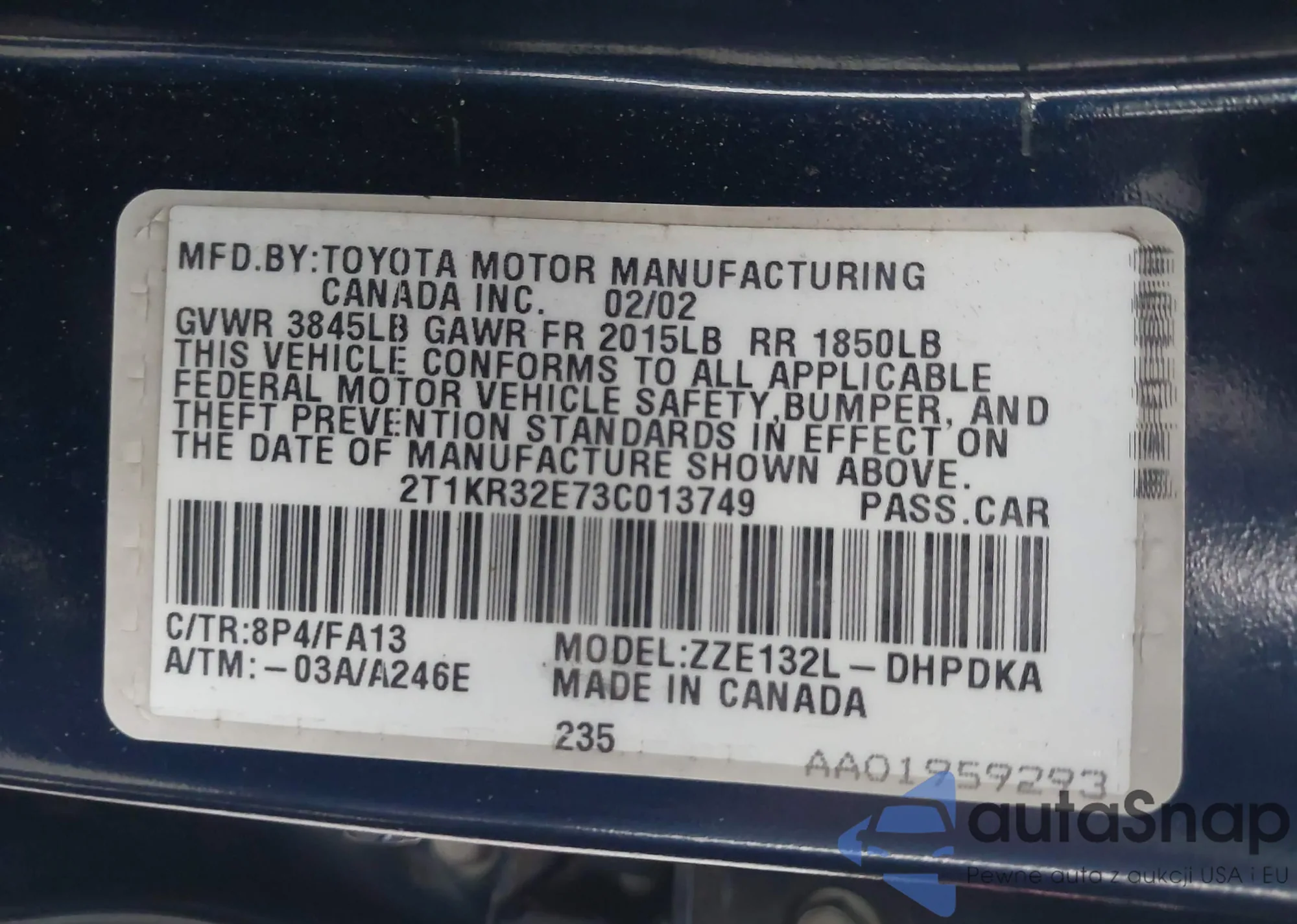 • VIN 2T1KR32E73C013749