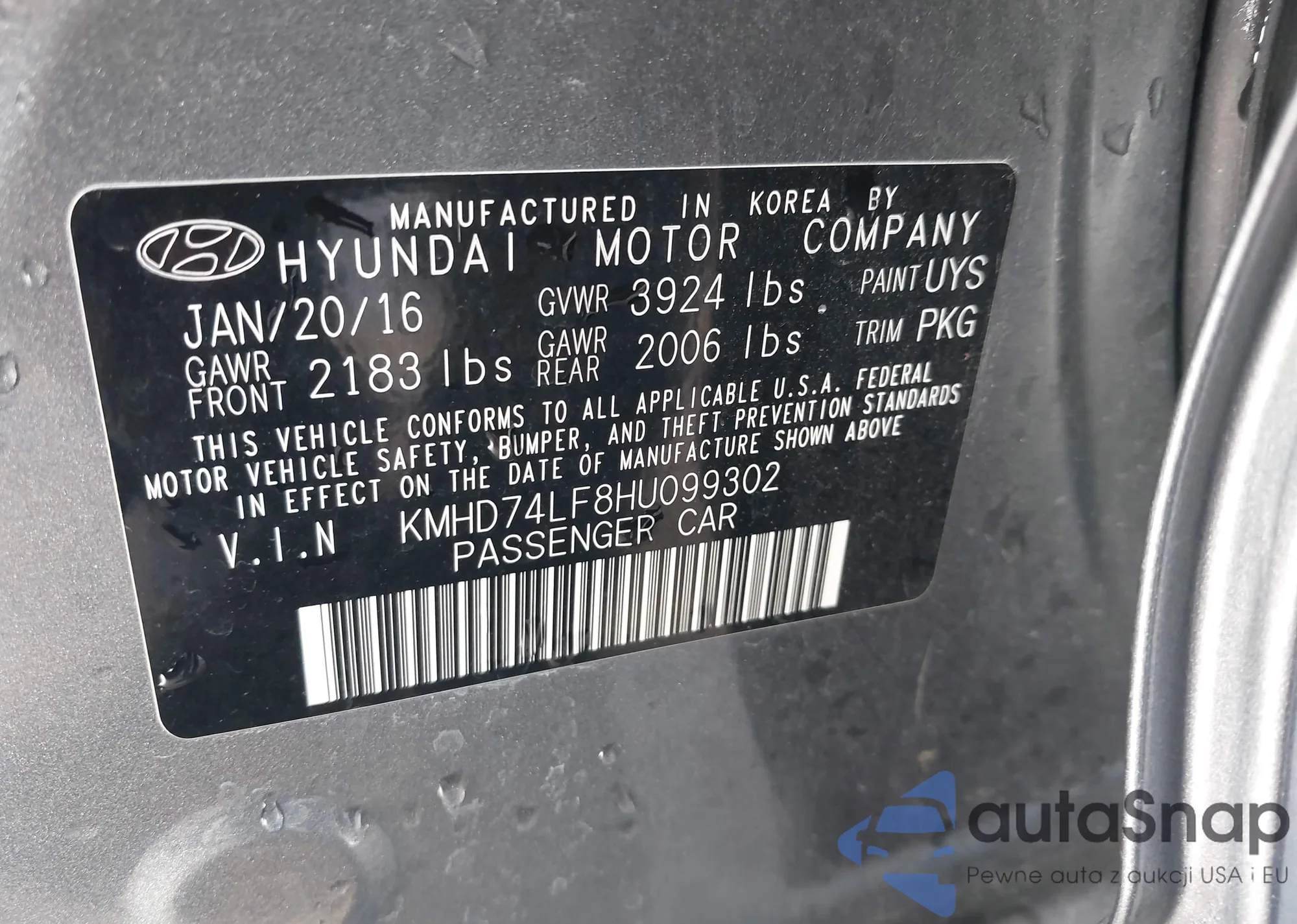 LOT: 43763945 VIN: KMHD74LF8HU099302