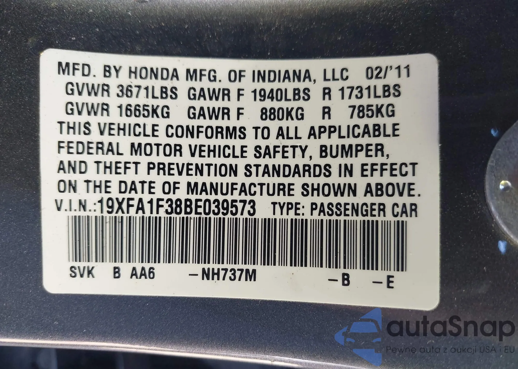 LOT: 43904984 VIN: 19XFA1F38BE039573