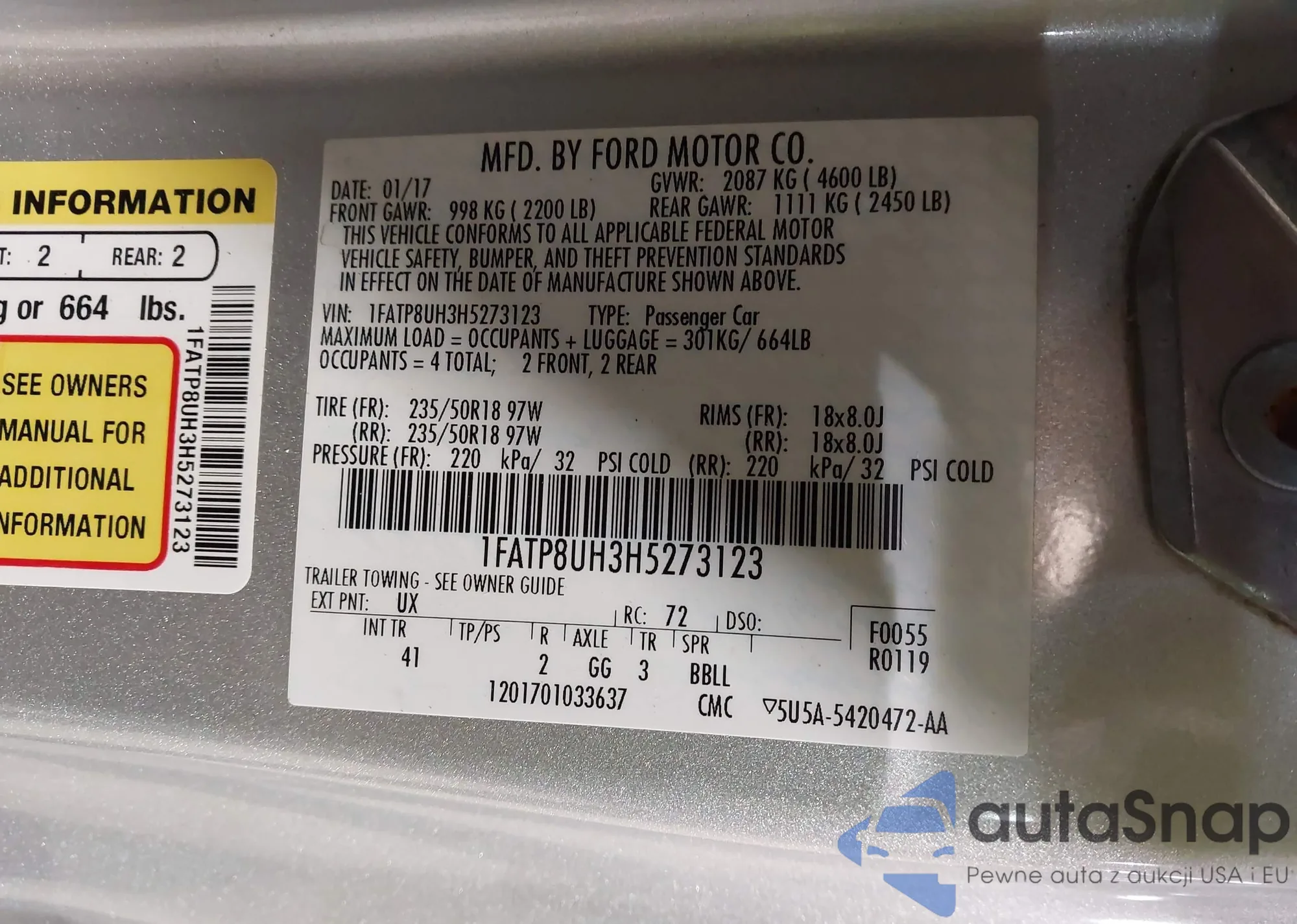 LOT: 43923878 VIN: 1FATP8UH3H5273123