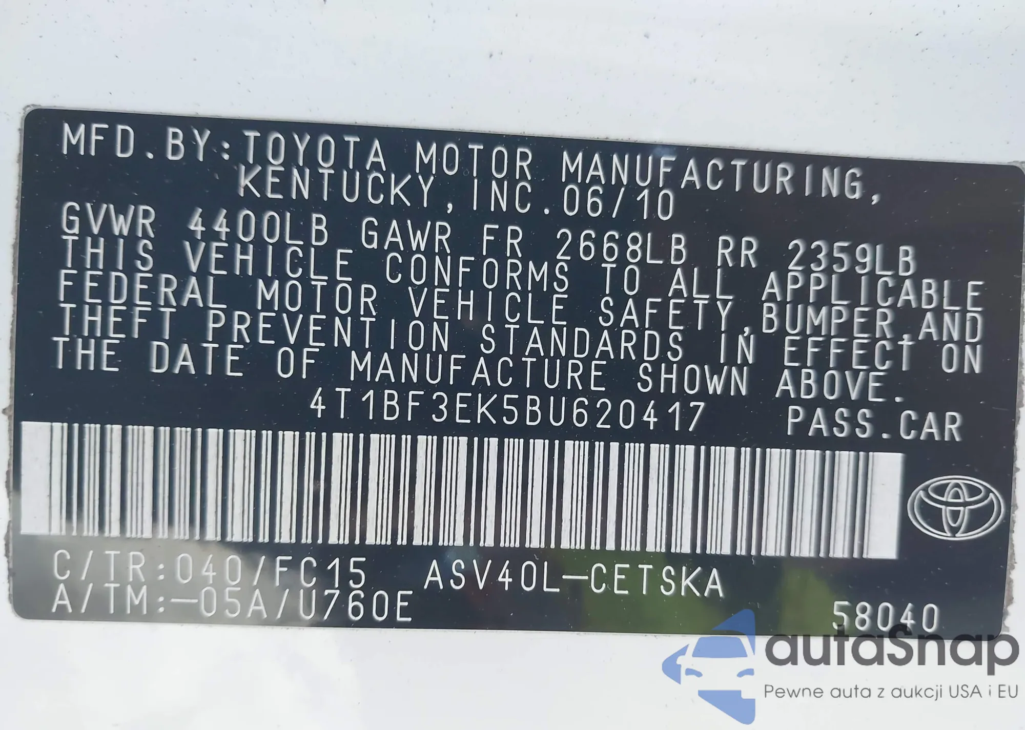 • VIN 4T1BF3EK5BU620417