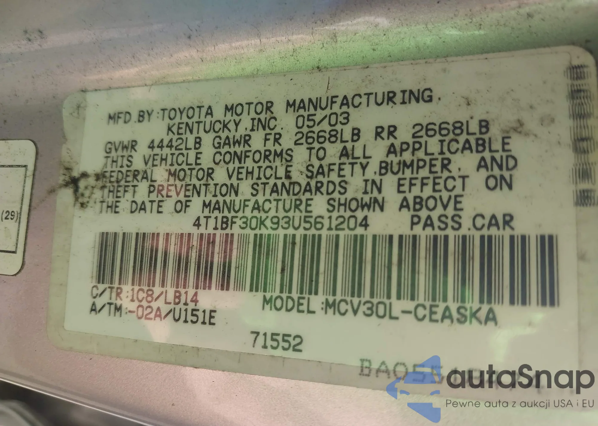 LOT: 44119562 VIN: 4T1BF30K93U561204