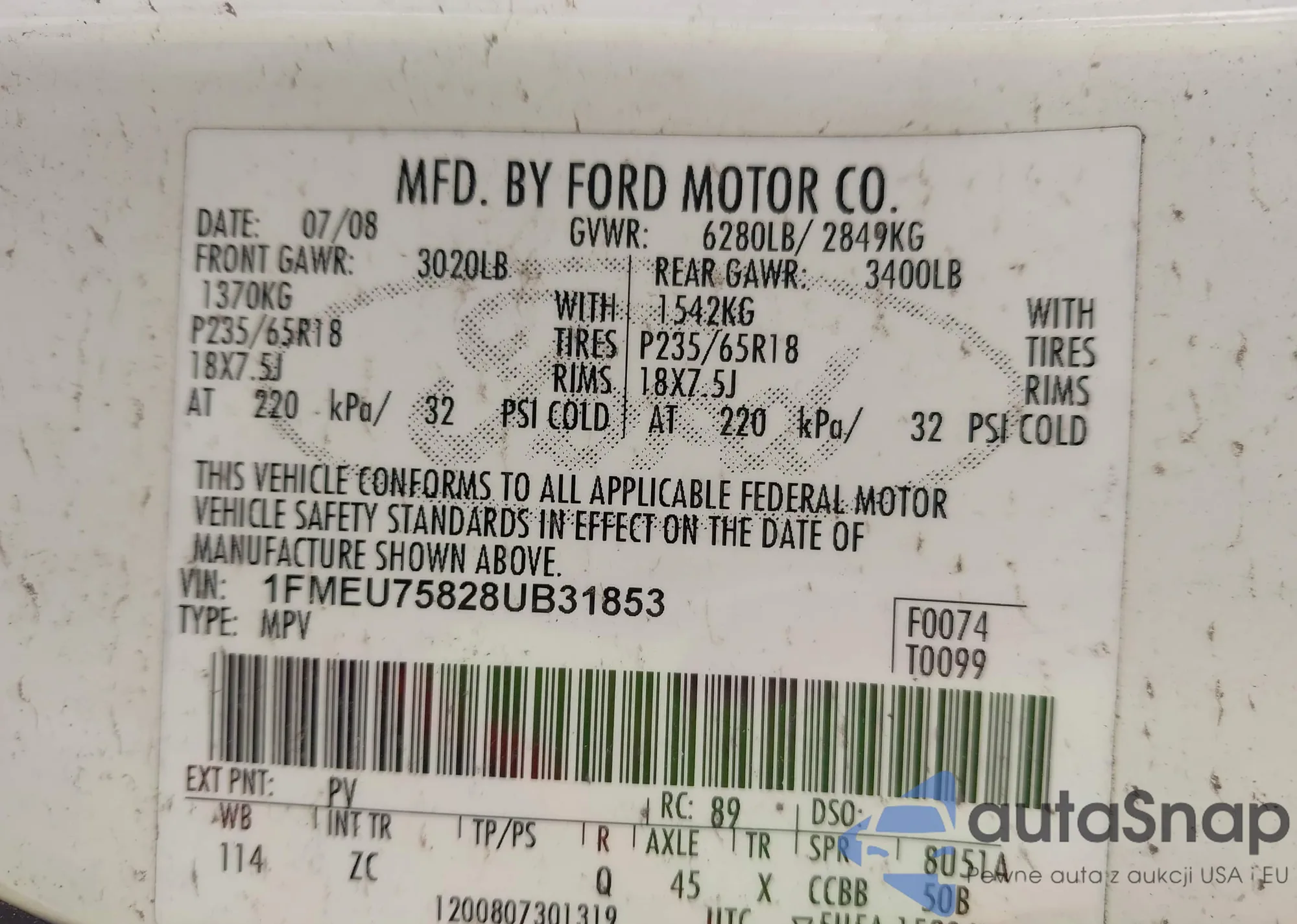 • VIN 1FMEU75828UB31853