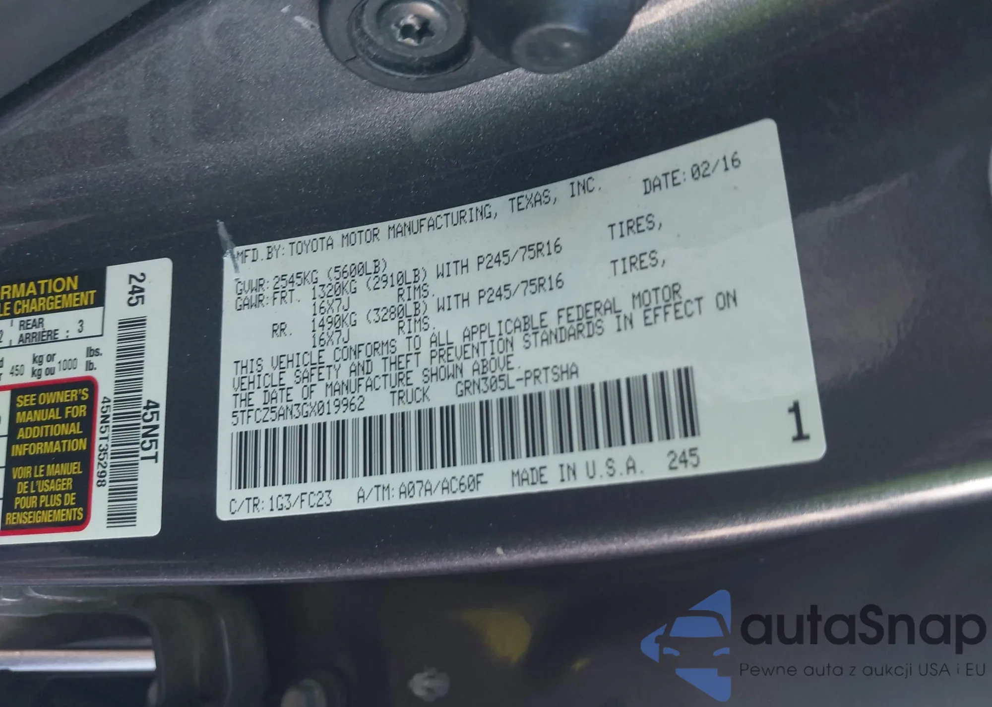 LOT: 43976452 VIN: 5TFCZ5AN3GX019962