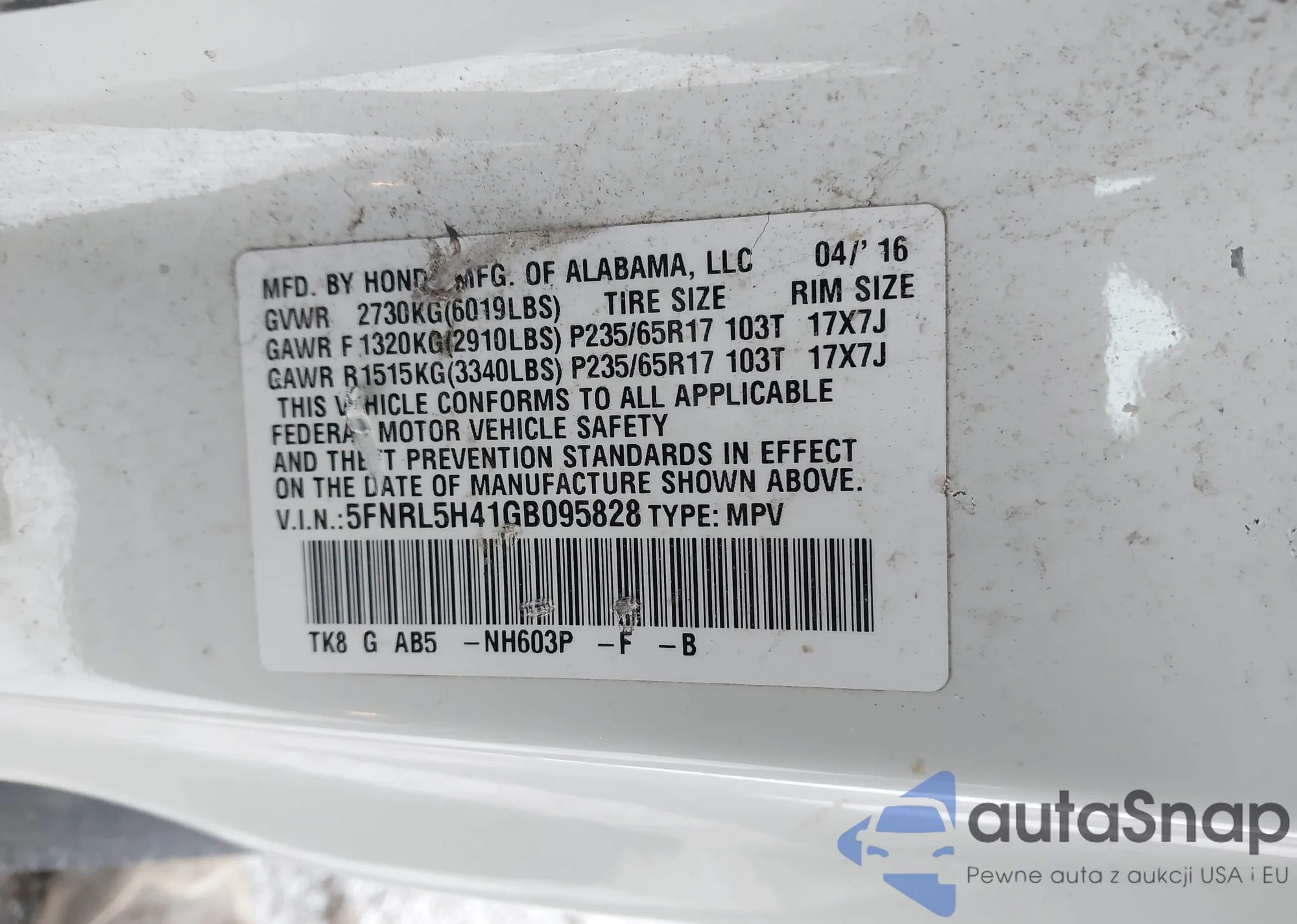 • VIN 5FNRL5H41GB095828