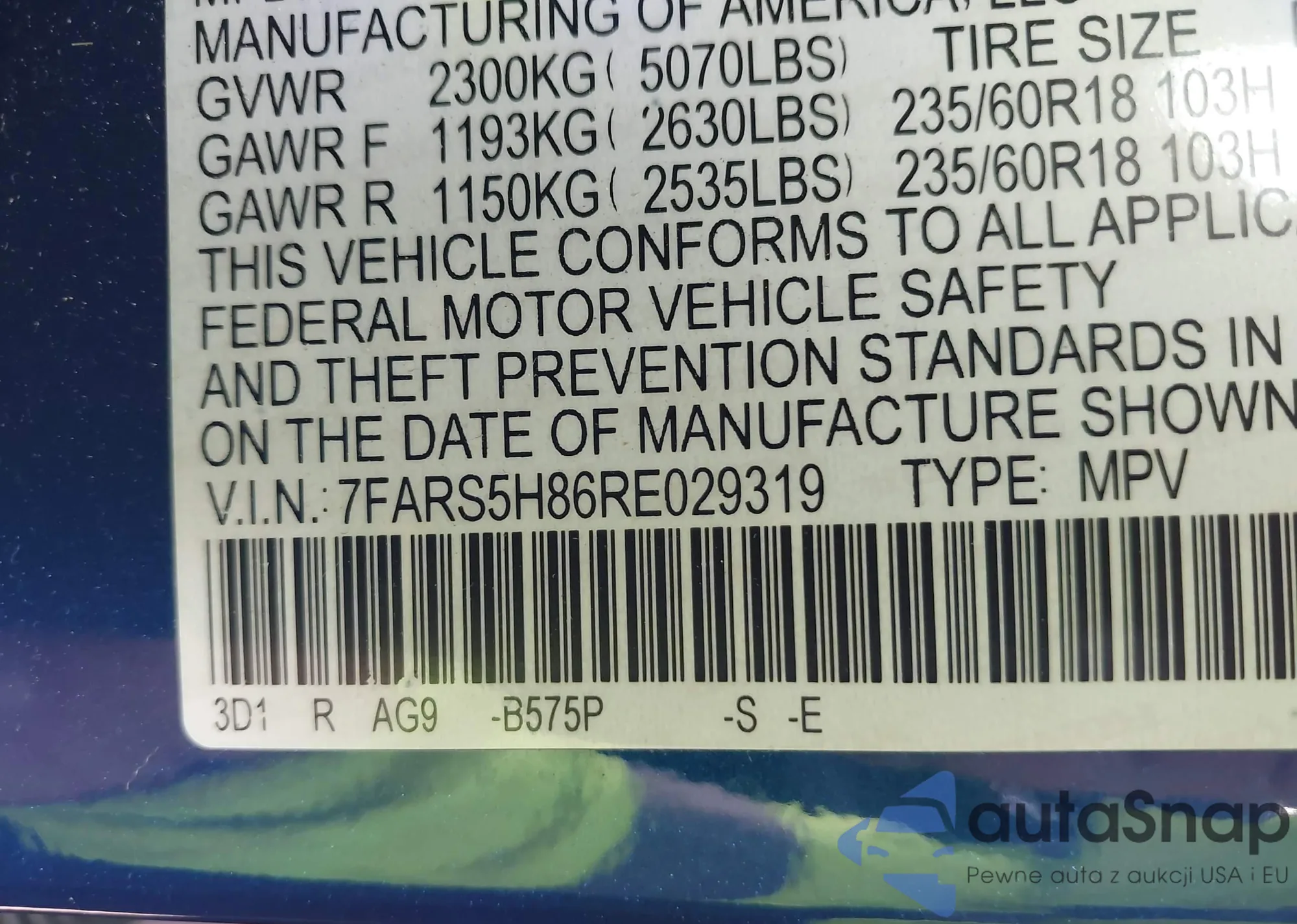 LOT: 43998166 VIN: 7FARS5H86RE029319