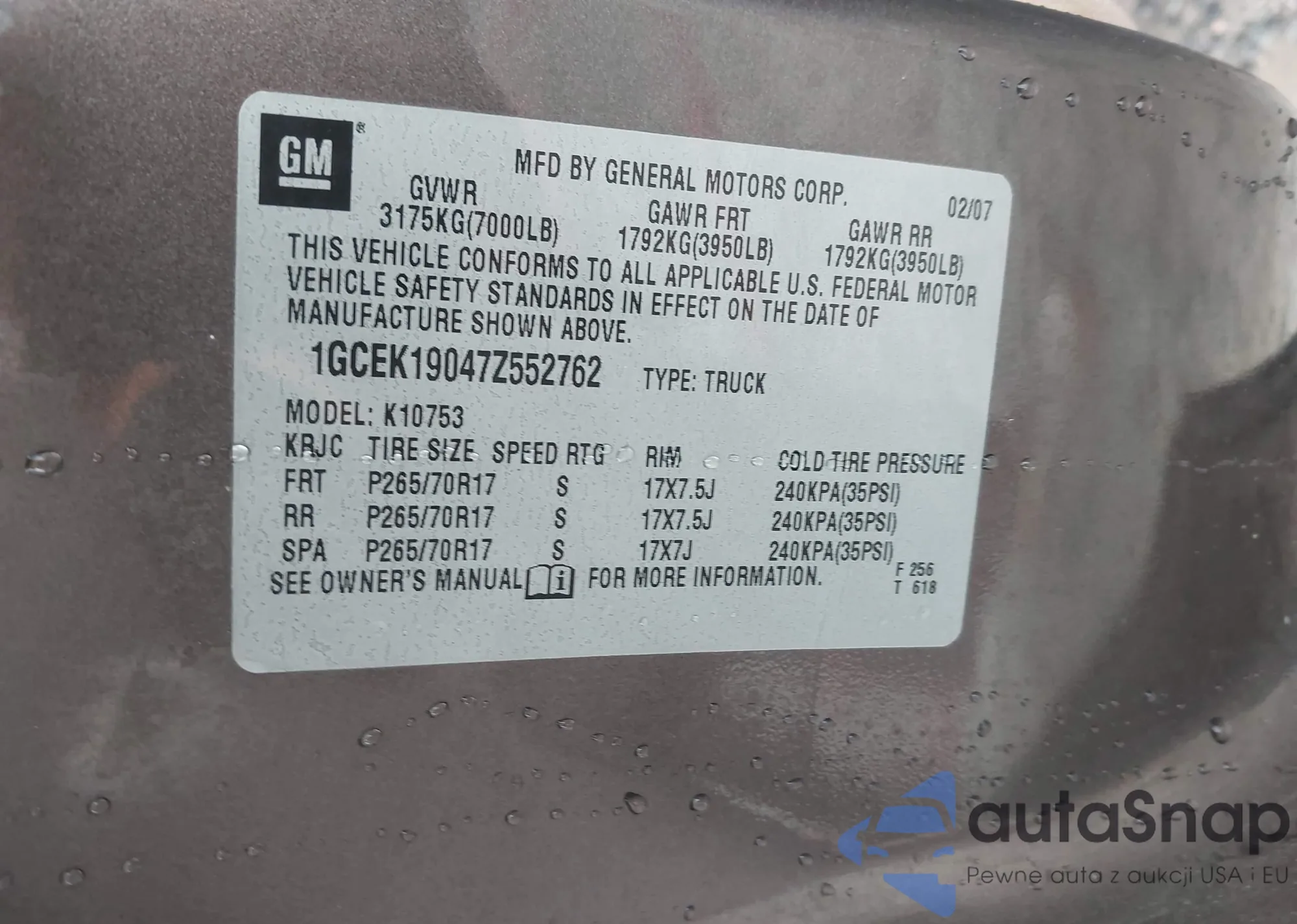 • VIN 1GCEK19047Z552762