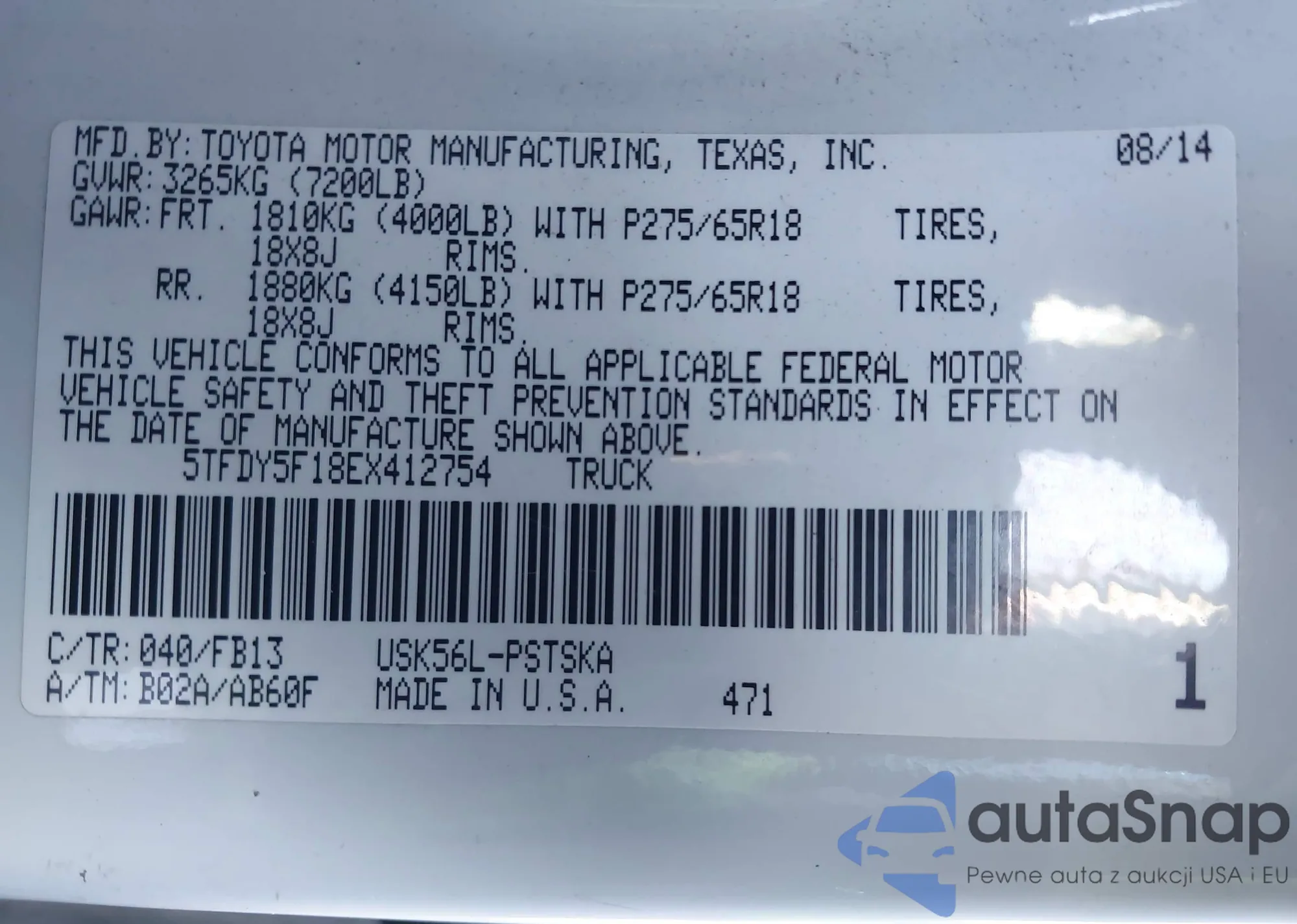 LOT: 43920841 VIN: 5TFDY5F18EX412754