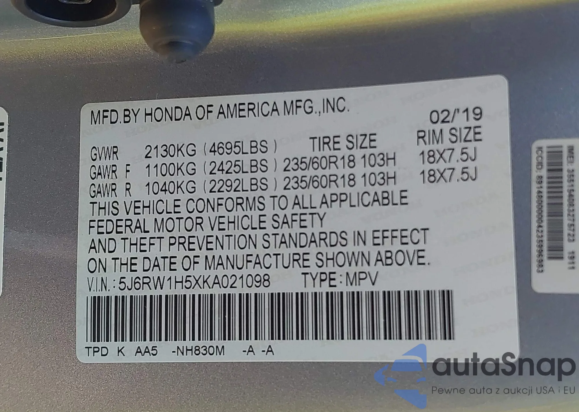 • VIN 5J6RW1H5XKA021098