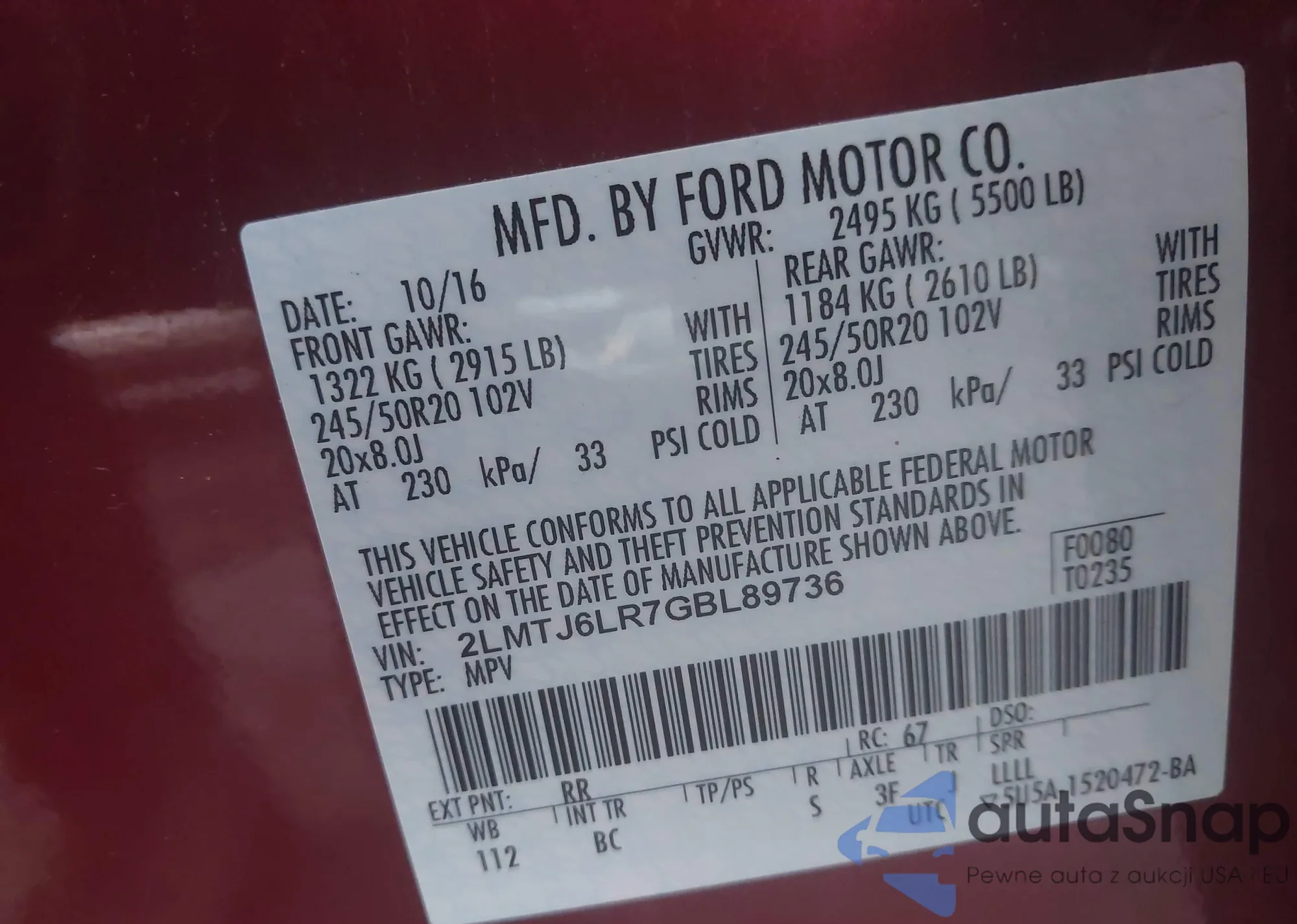 LOT: 43820522 VIN: 2LMTJ6LR7GBL89736