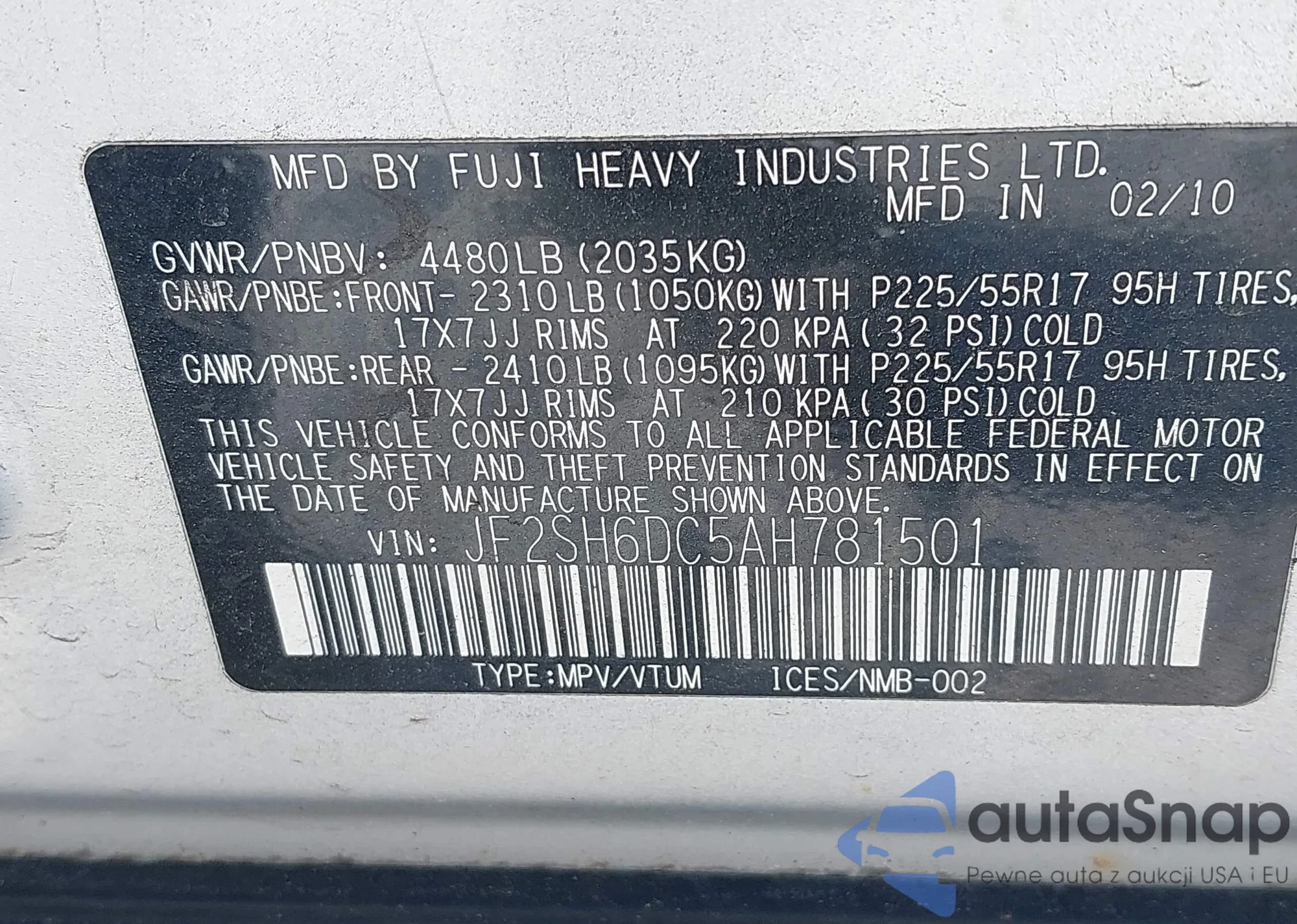 • VIN JF2SH6DC5AH781501