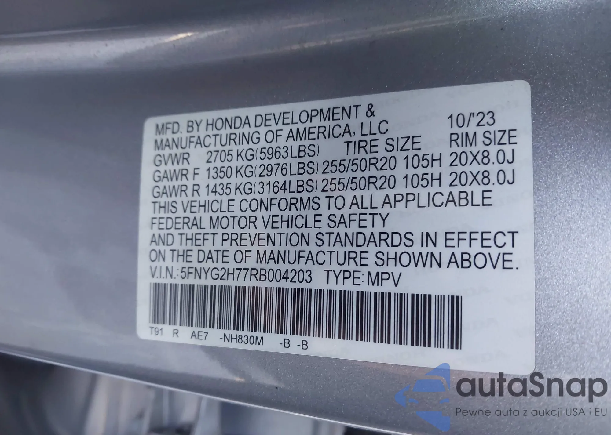 • VIN 5FNYG2H77RB004203