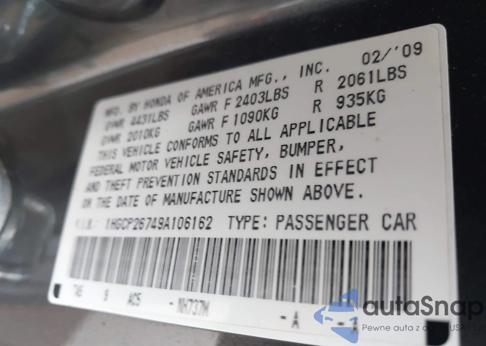 • VIN 1HGCP26749A106162