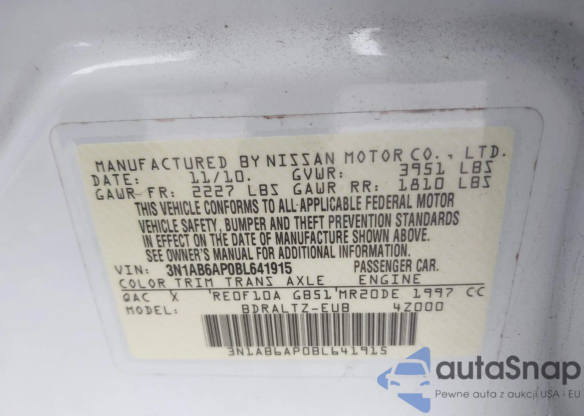 • VIN 3N1AB6AP0BL641915