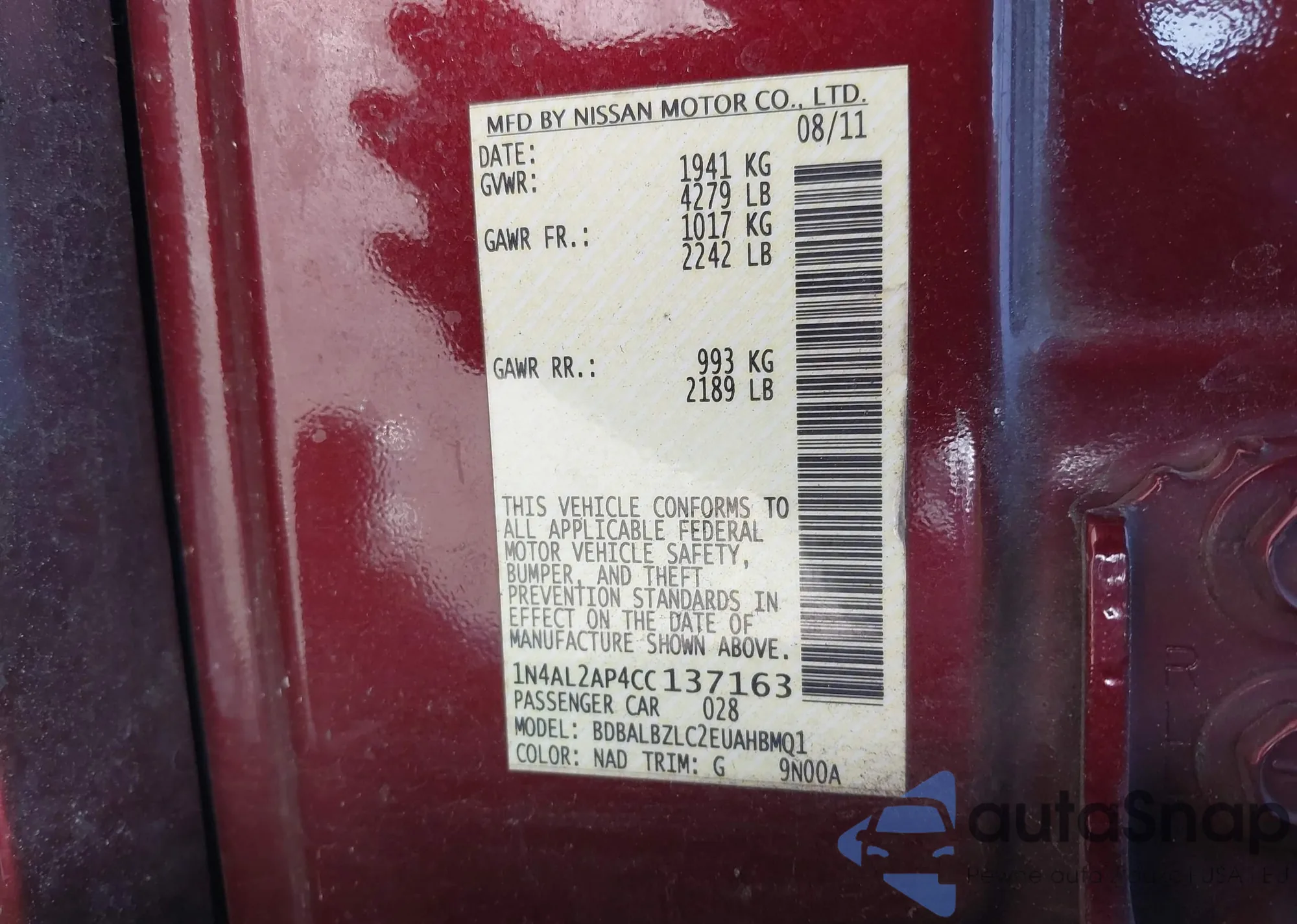 LOT: 43963322 VIN: 1N4AL2AP3BC169763