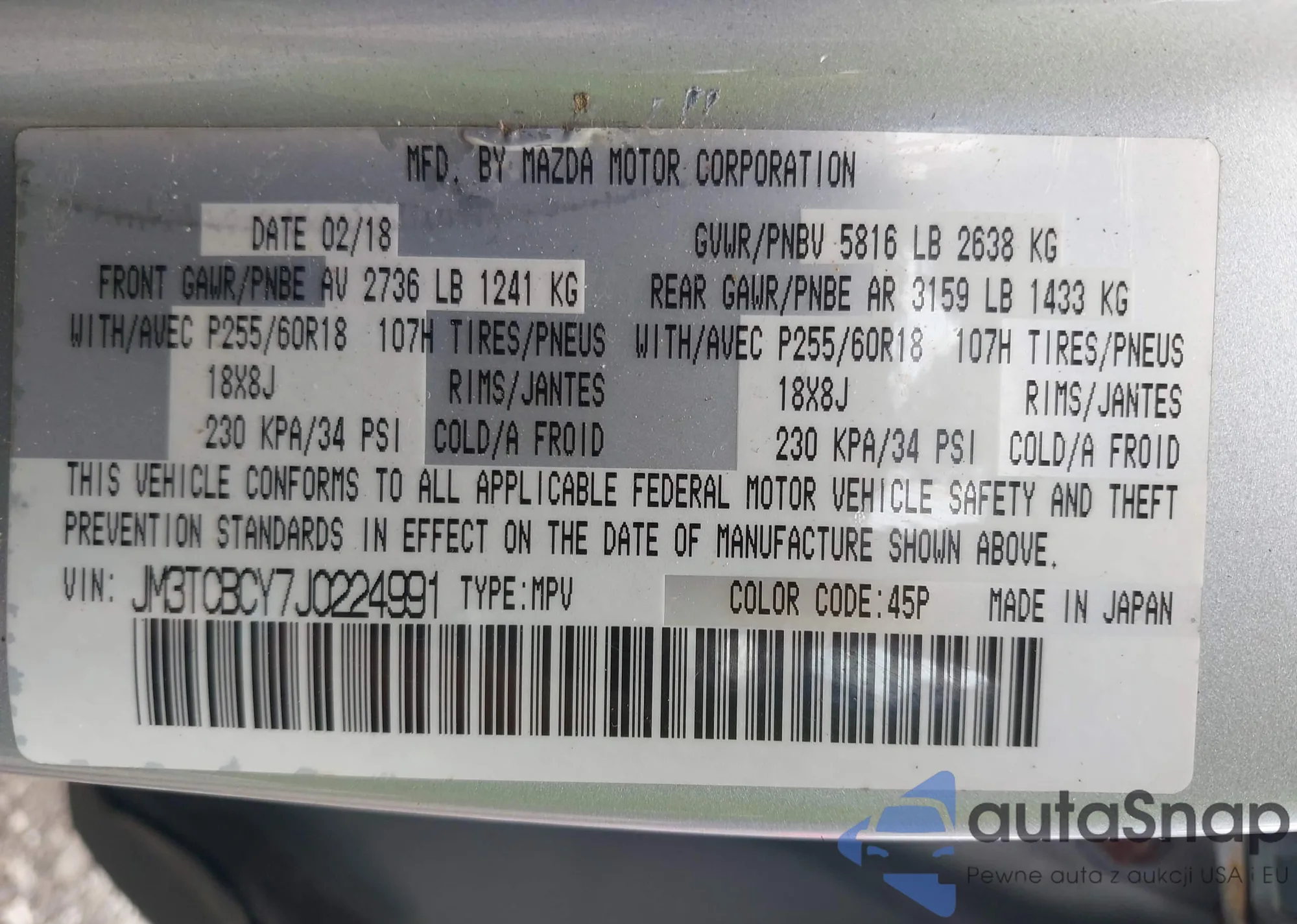 LOT: 42683463 VIN: JM3TCBCY7J0224991