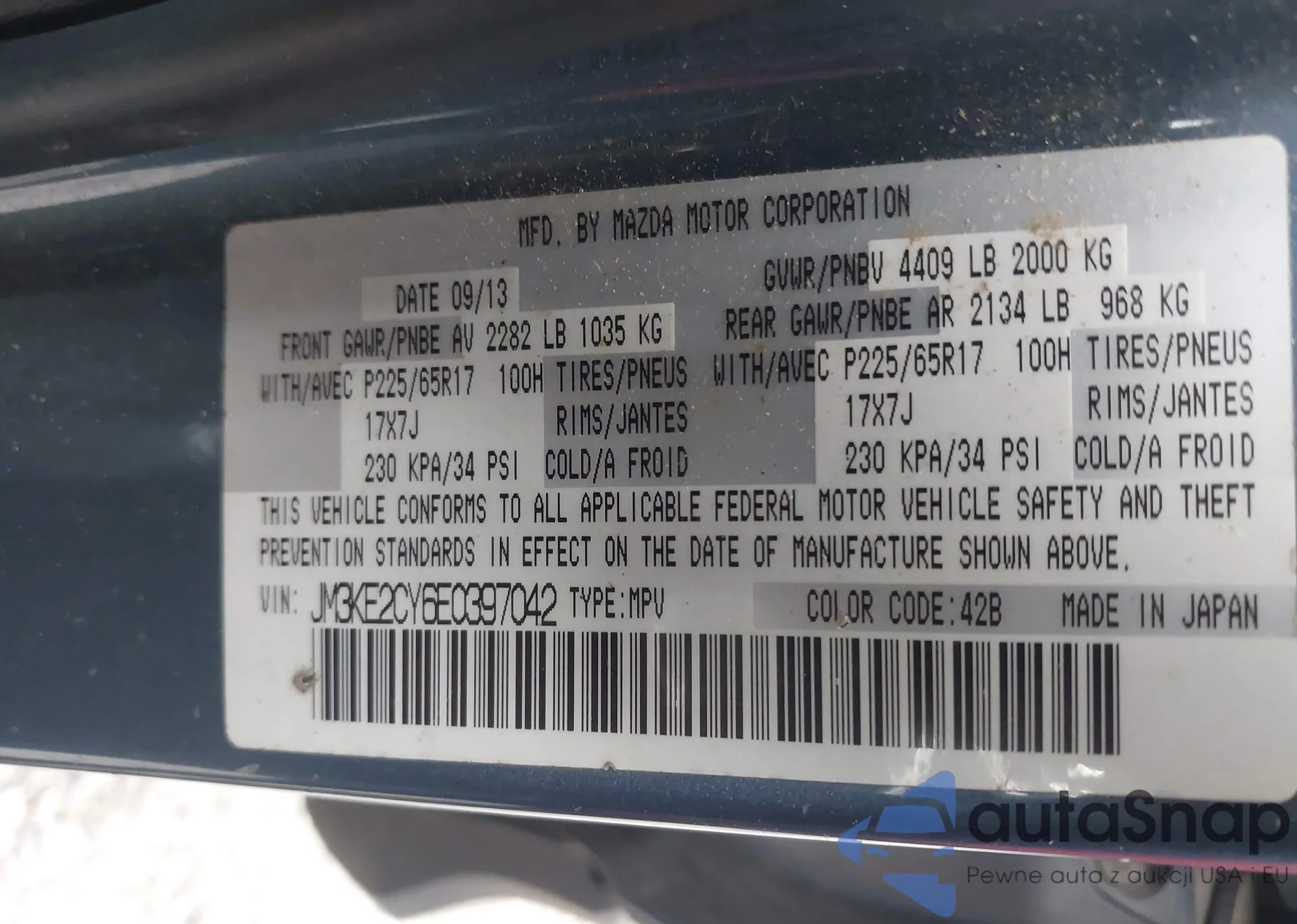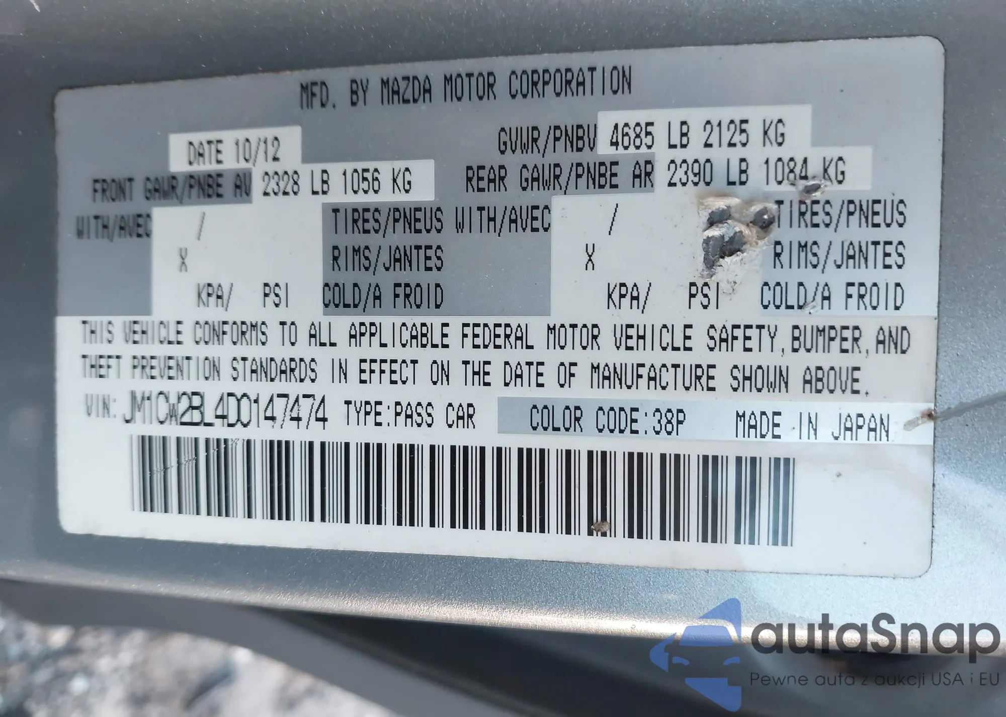 LOT: 44048674 VIN: JM1CW2BL4D0147474