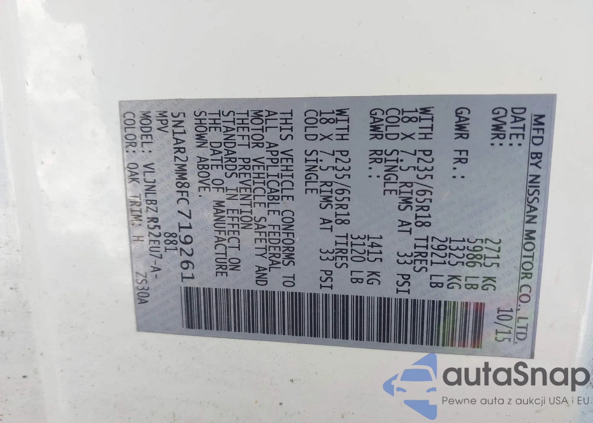 LOT: 43934574 VIN: 5N1AR2MM8FC719261