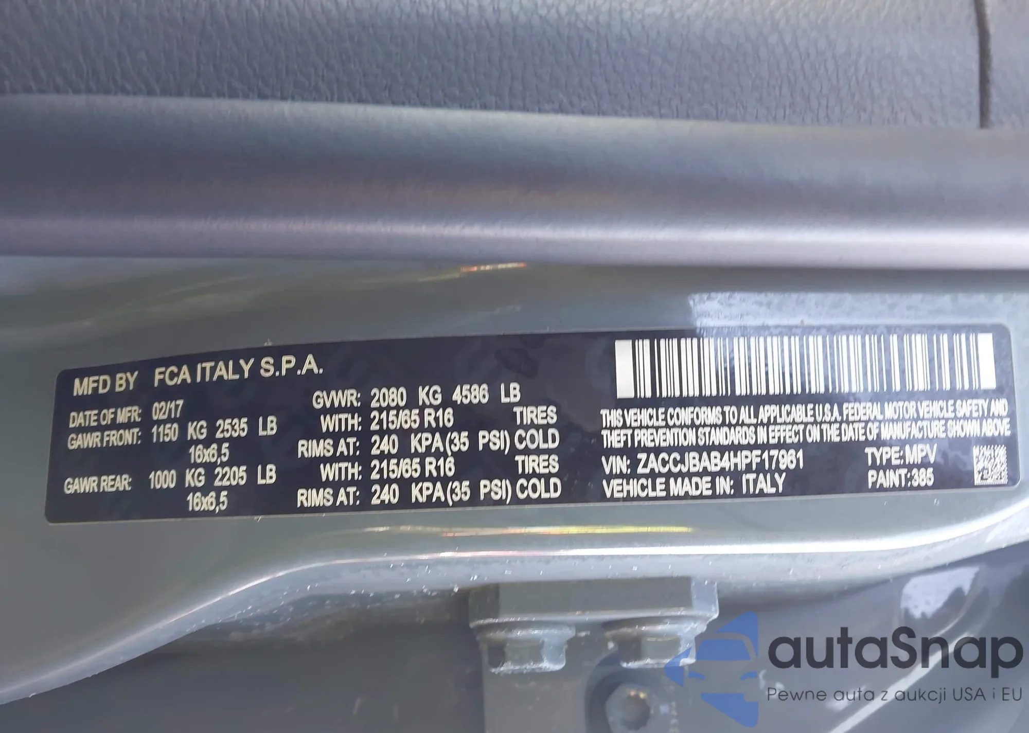 LOT: 43953812 VIN: ZACCJBAB4HPF17961