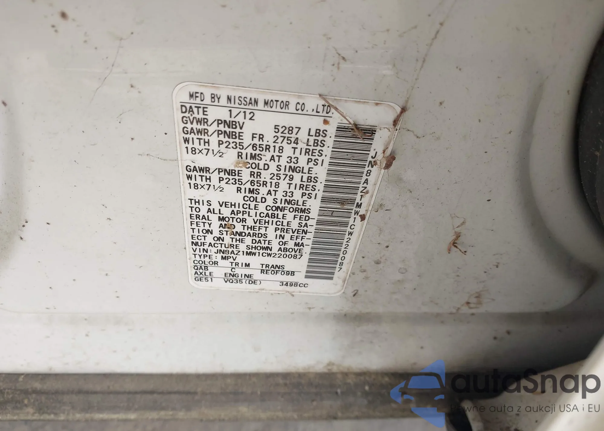 • VIN JN8AZ1MW1CW220087