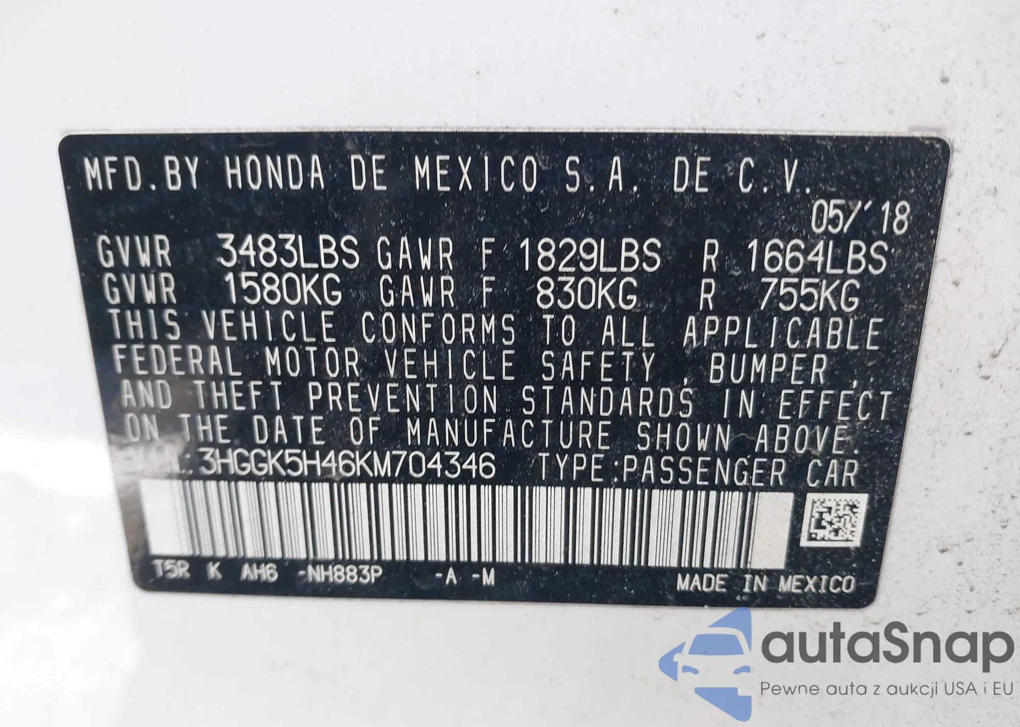 • VIN 3HGGK5H46KM704346