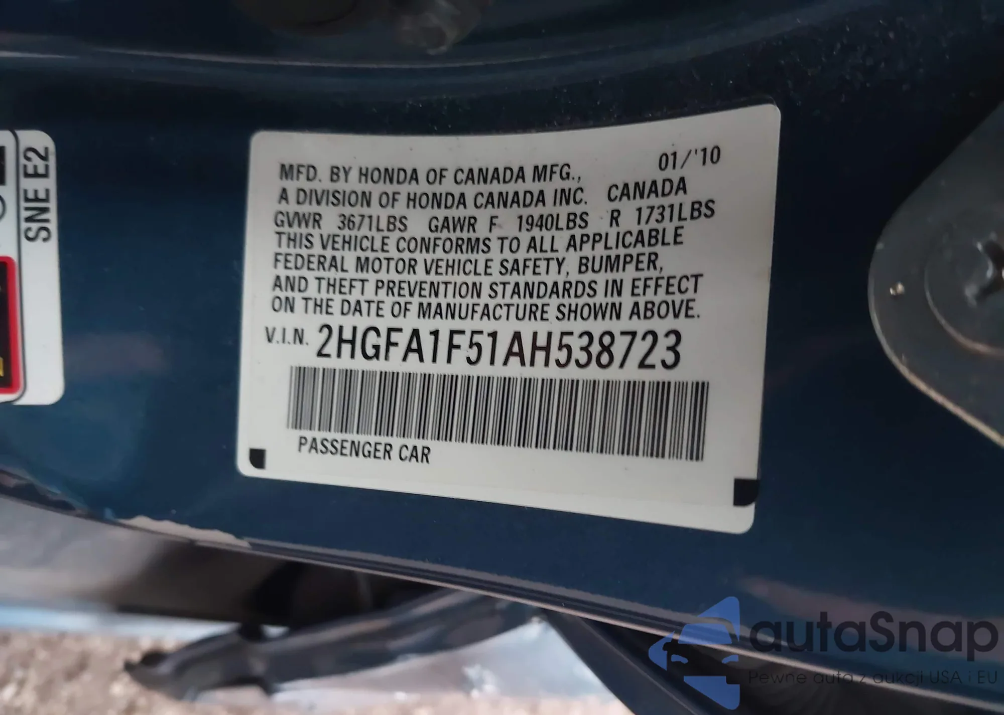• VIN 2HGFA1F51AH538723