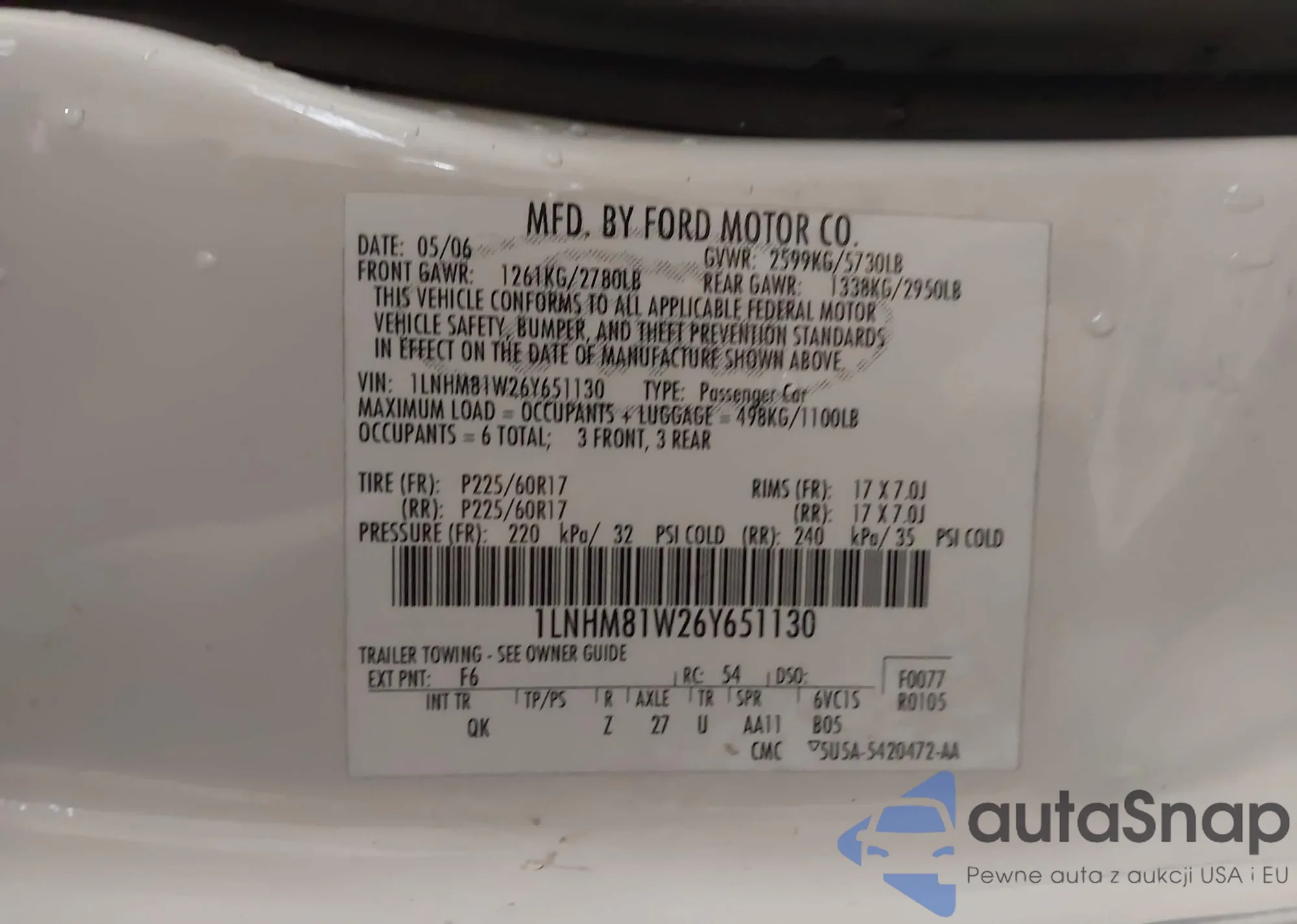 LOT: 43717341 VIN: 1LNHM81W26Y651130