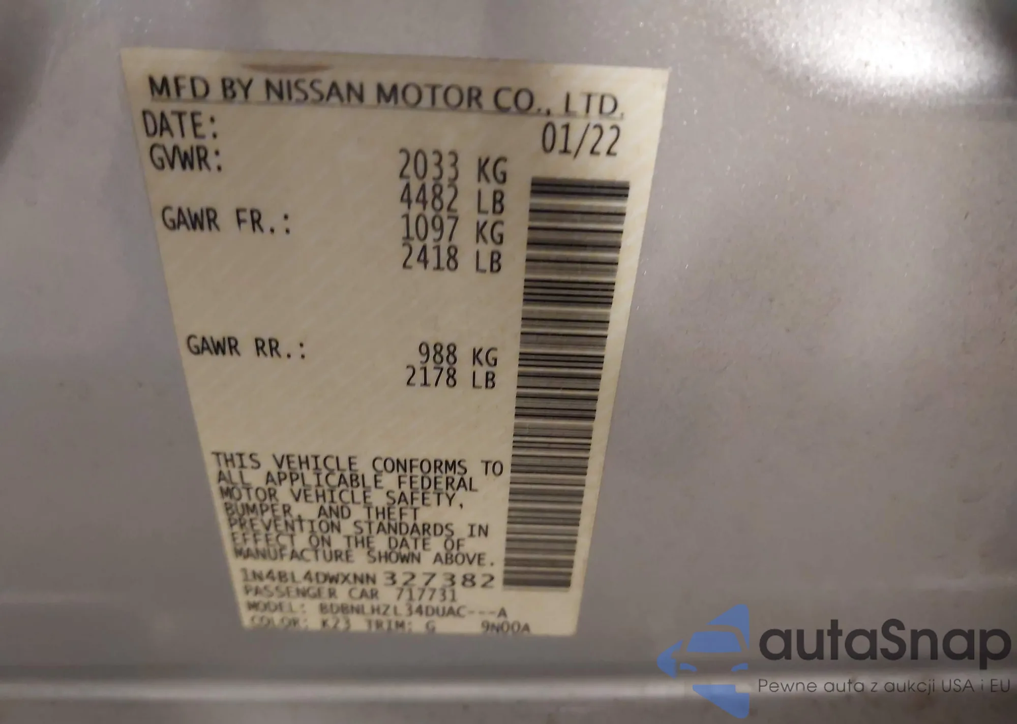 LOT: 41158156 VIN: 1N4BL4DWXNN327382