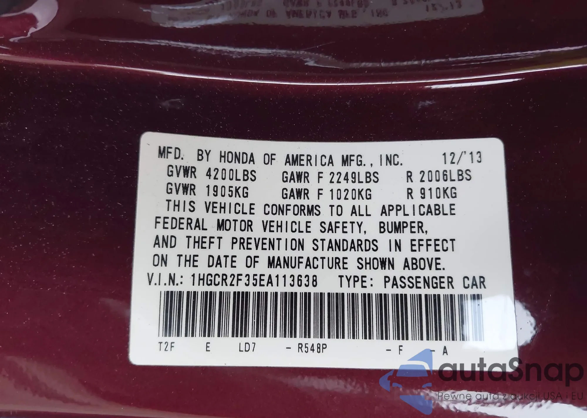 LOT: 44044110 VIN: 1HGCR2F35EA113638