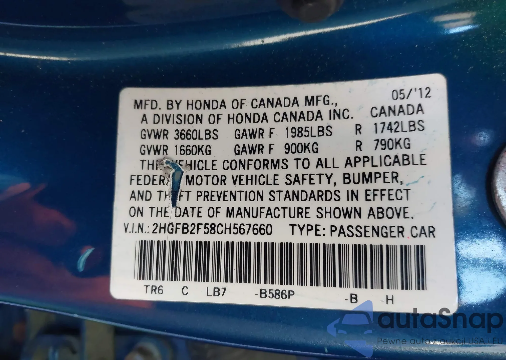 LOT: 43868406 VIN: 2HGFB2F58CH567660