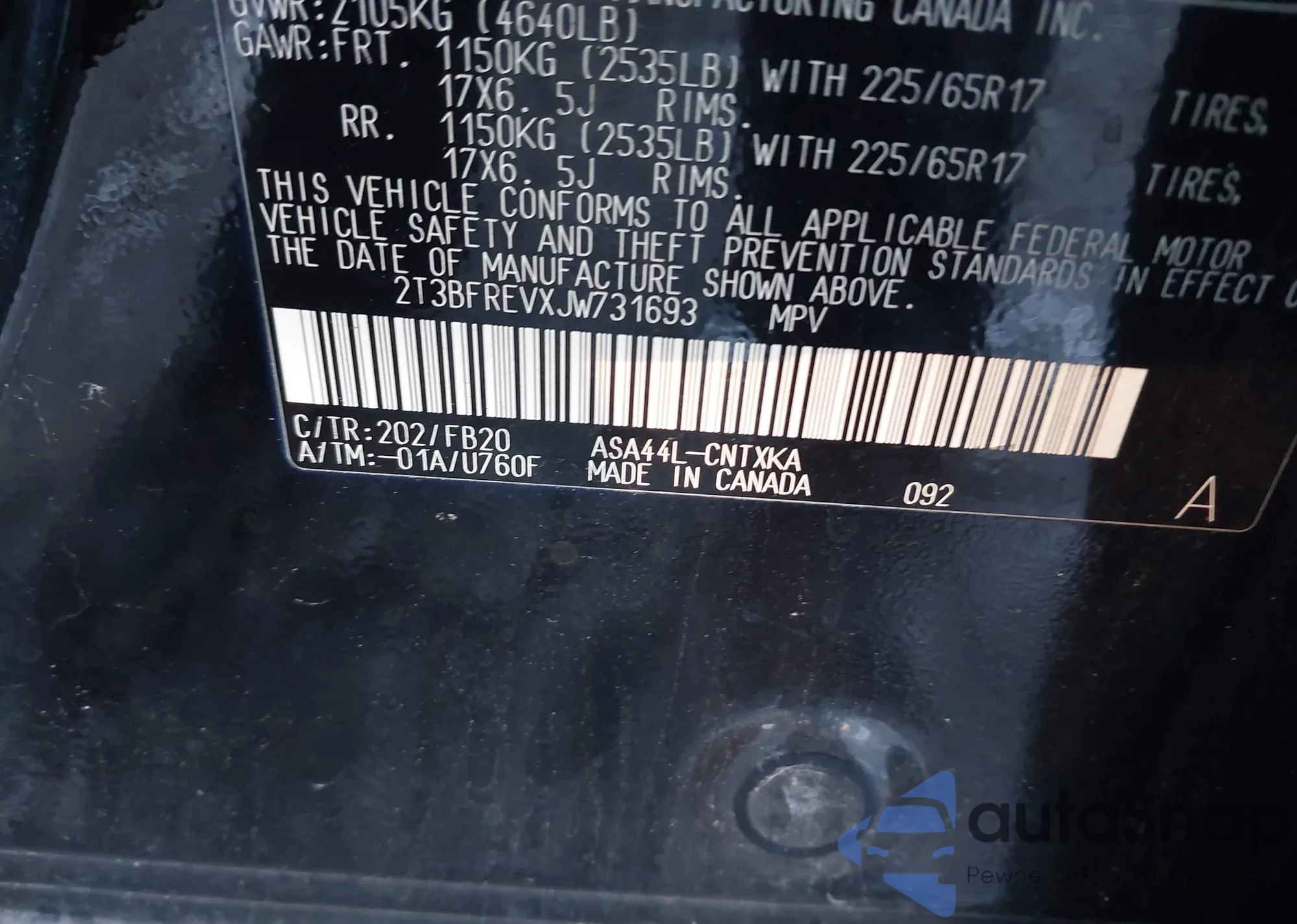 • VIN 2T3BFREVXJW731693
