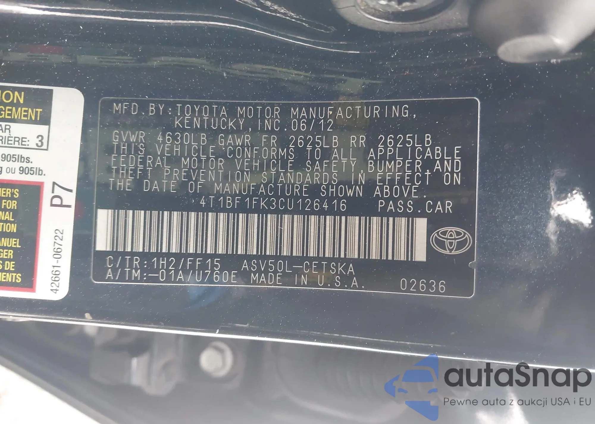 • VIN 4T1BF1FK3CU126416
