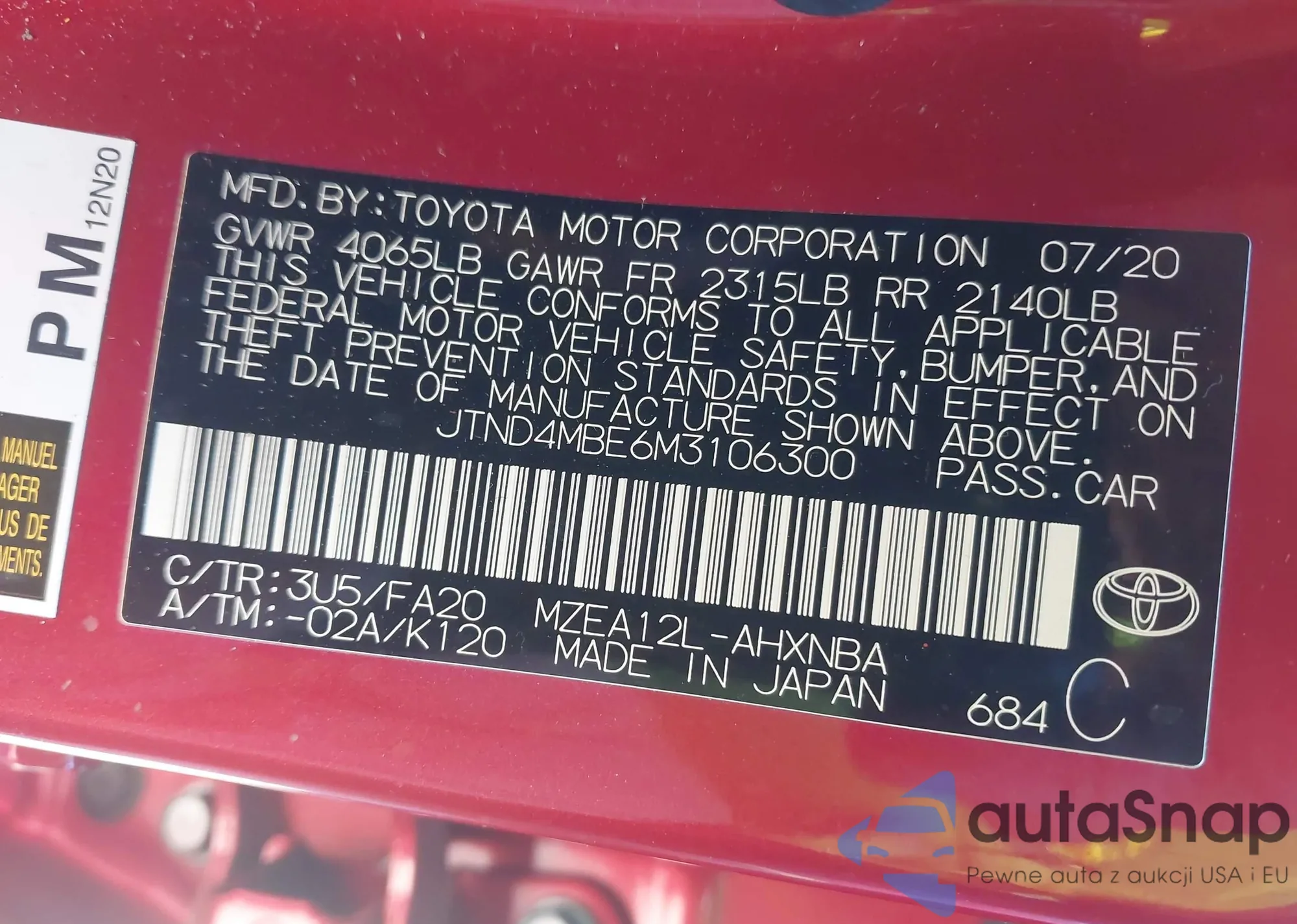 LOT: 43356797 VIN: JTND4MBE6M3106300