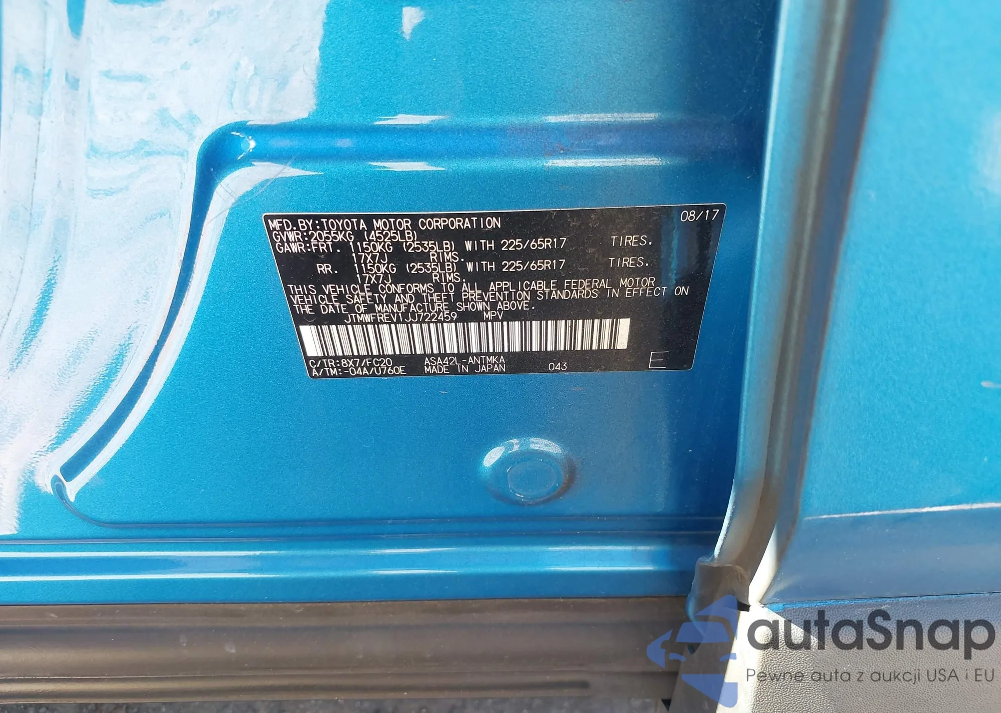 LOT: 43619055 VIN: JTMWFREV1JJ722459