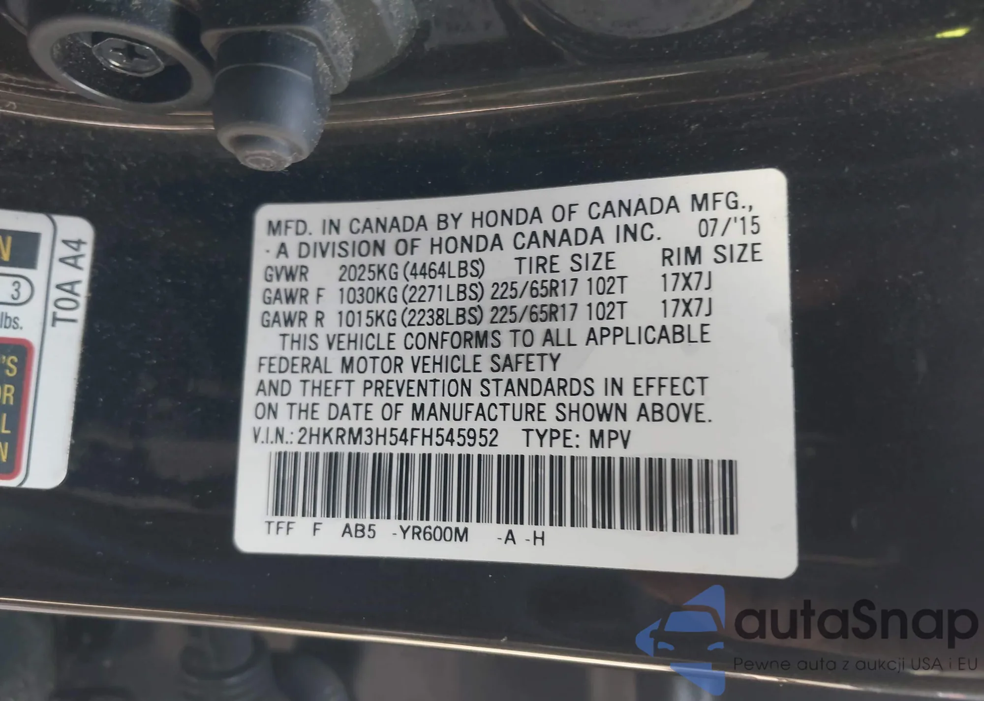 • VIN 2HKRM3H54FH545952