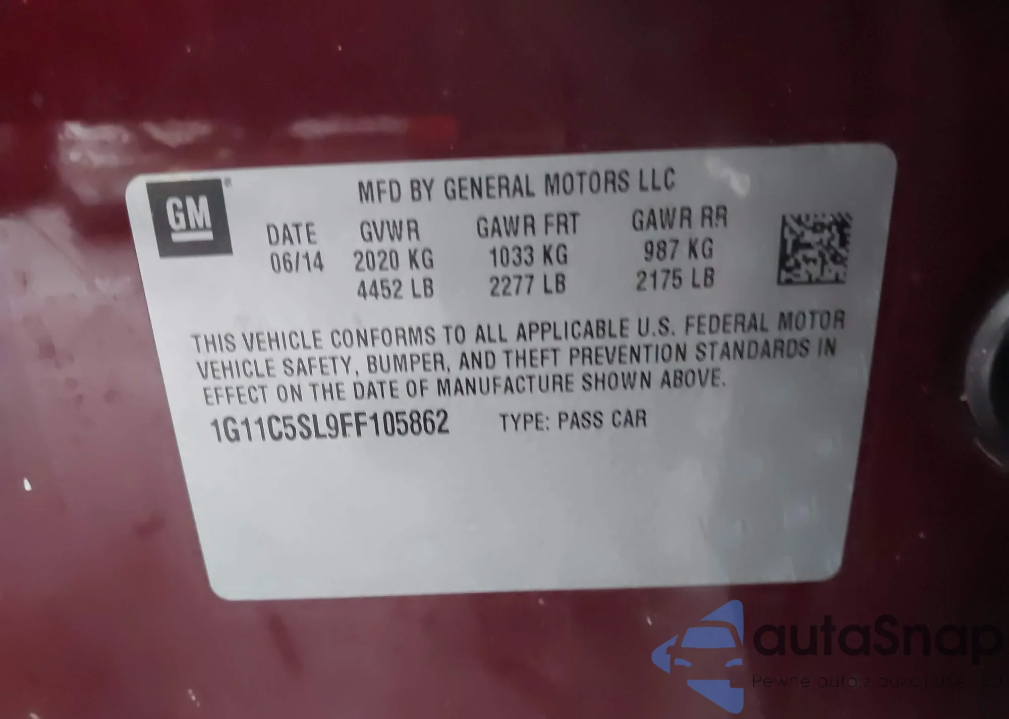 LOT: 43978979 VIN: 1G11C5SL9FF105862
