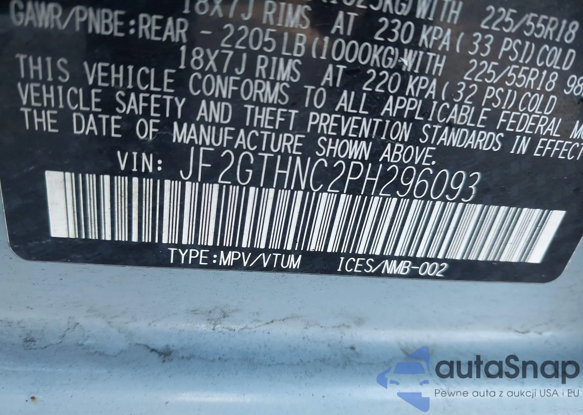 LOT: 43786156 VIN: JF2GTHNC2PH296093