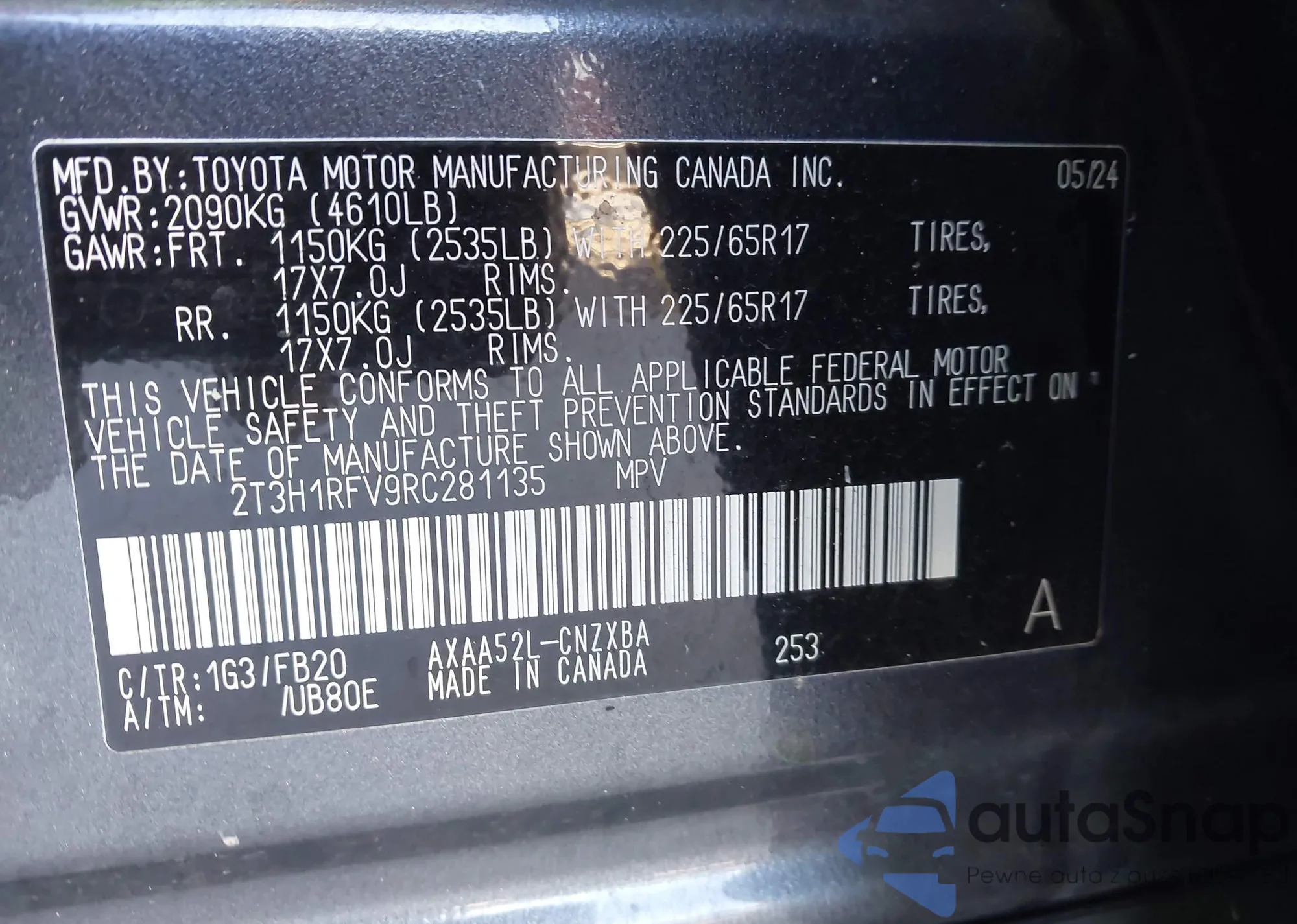 LOT: 43703245 VIN: 2T3H1RFV9RC281135