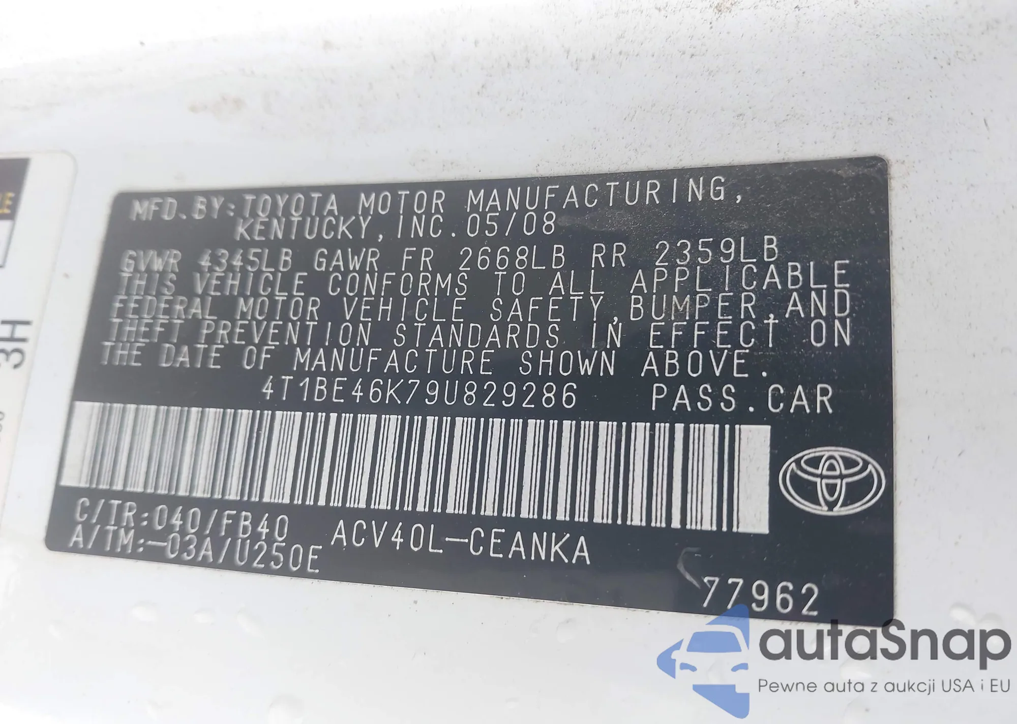 LOT: 43901913 VIN: 4T1BE46K79U829286