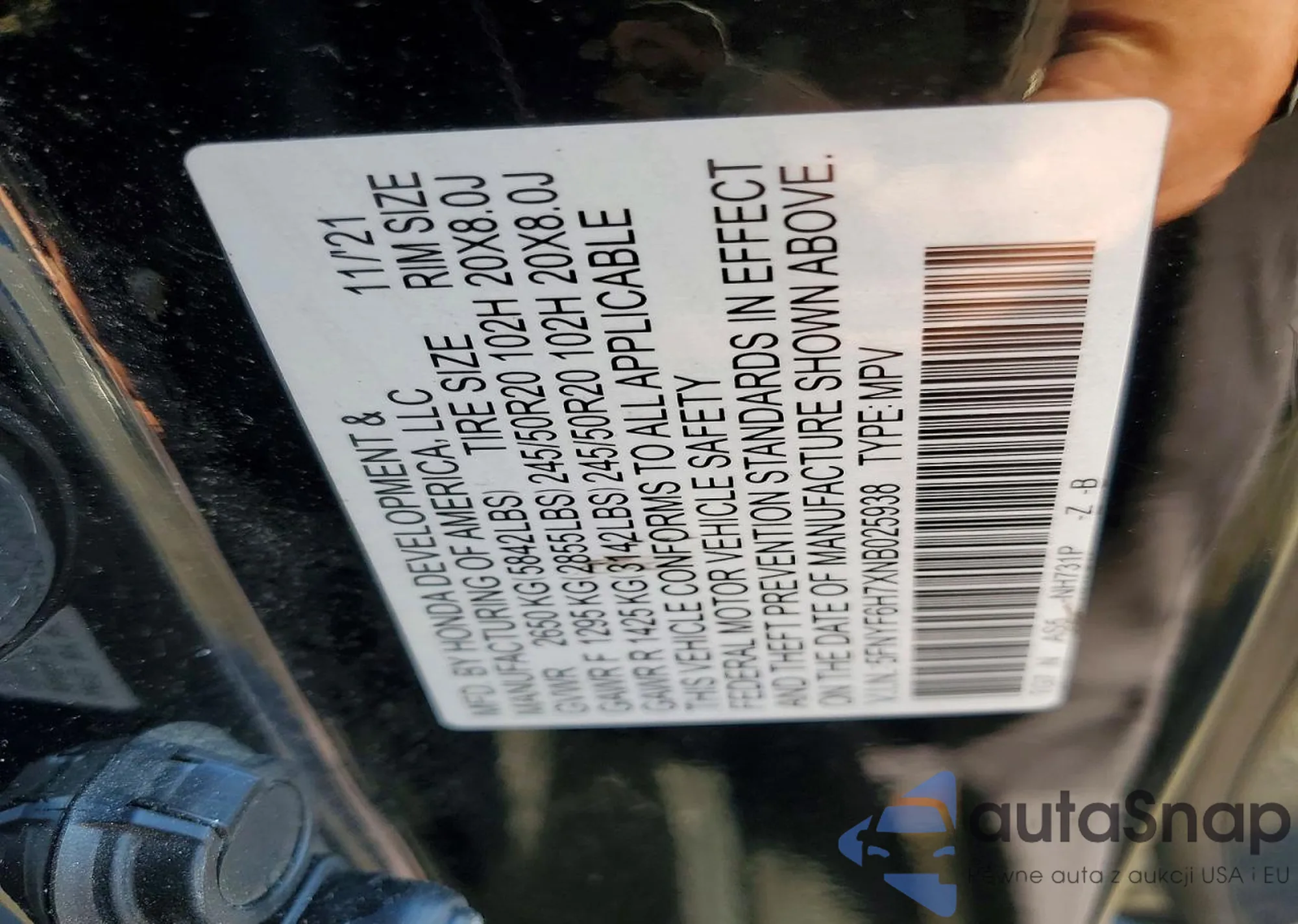 • VIN 5FNYF6H54MB066952