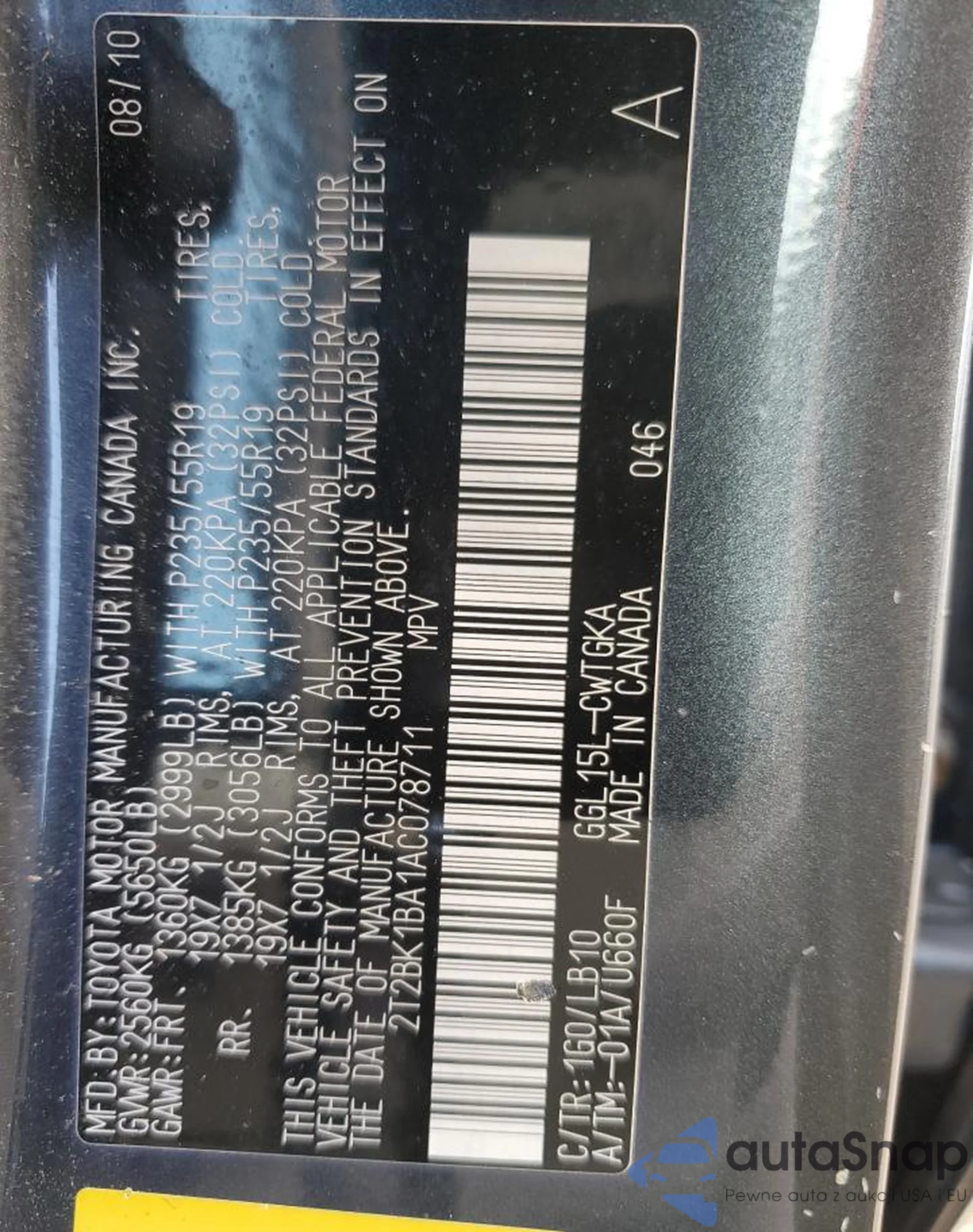 • VIN 2T2BK1BA1AC078711